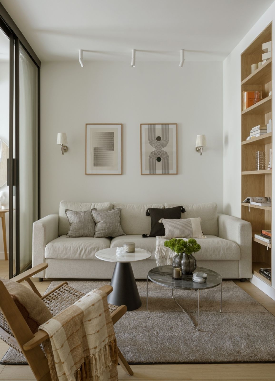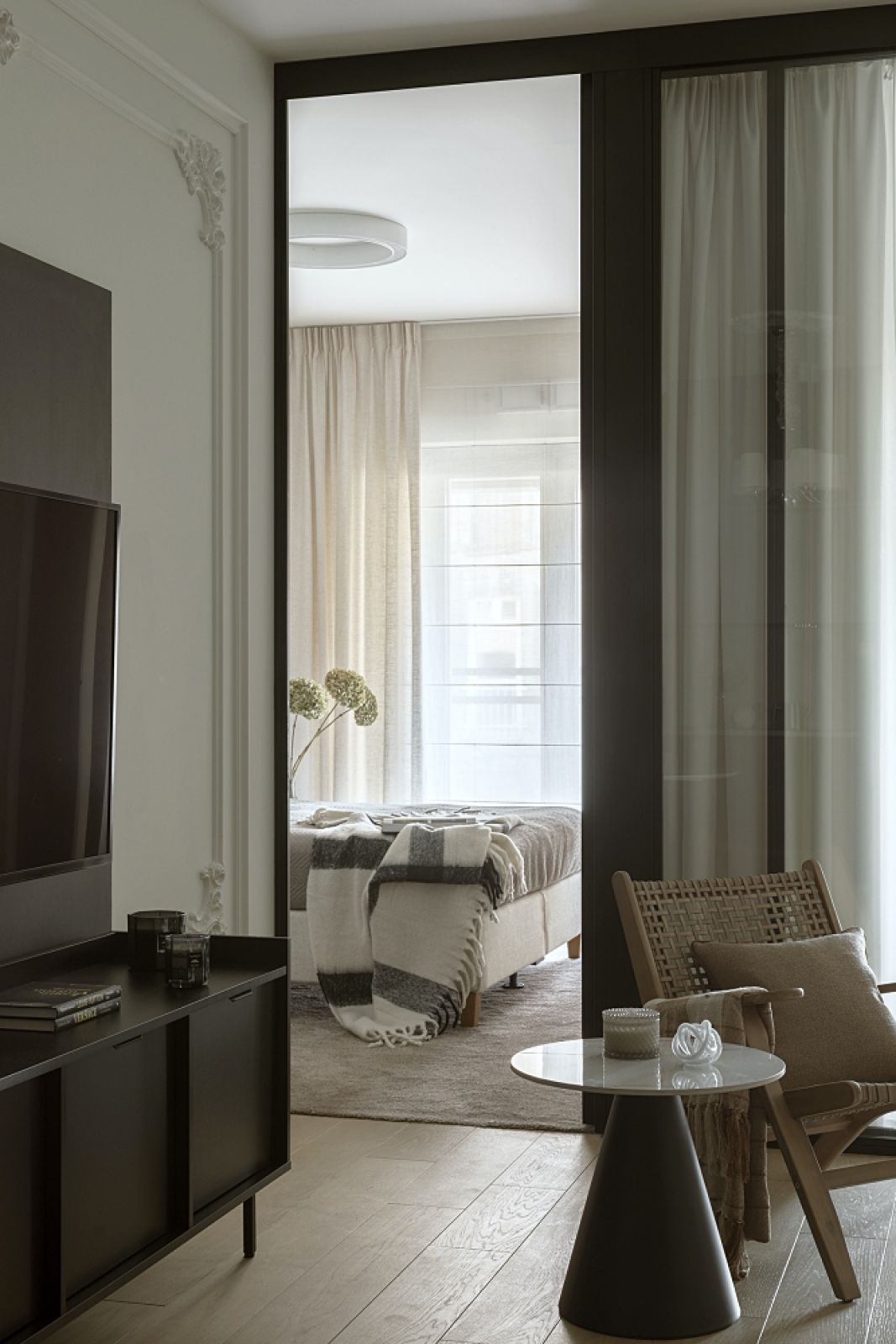 Salon w 60-metrowym mieszkaniu, który „pożycza światło” z sypialni i gabinetu