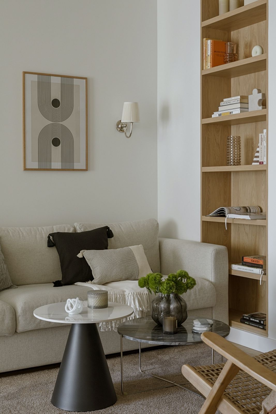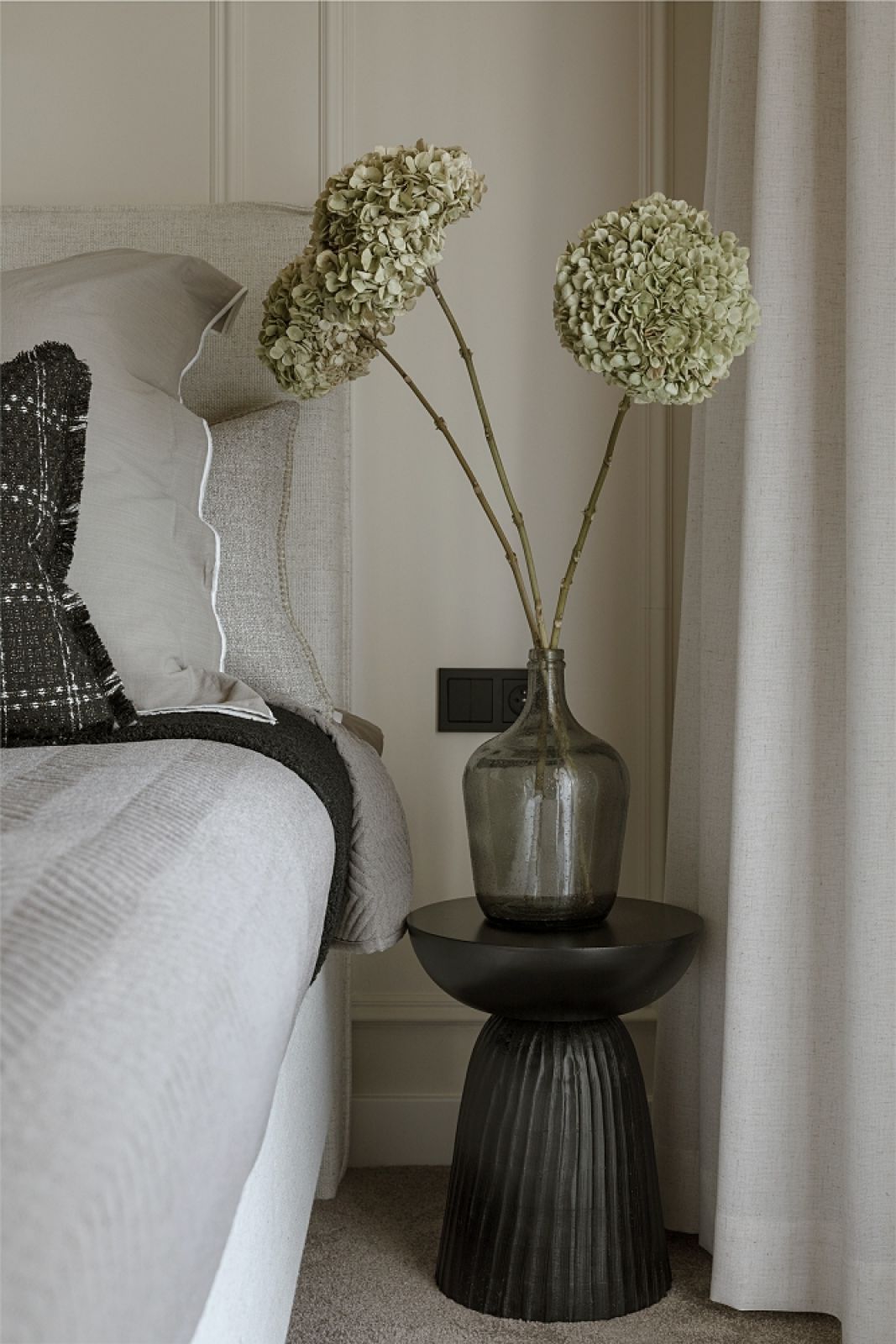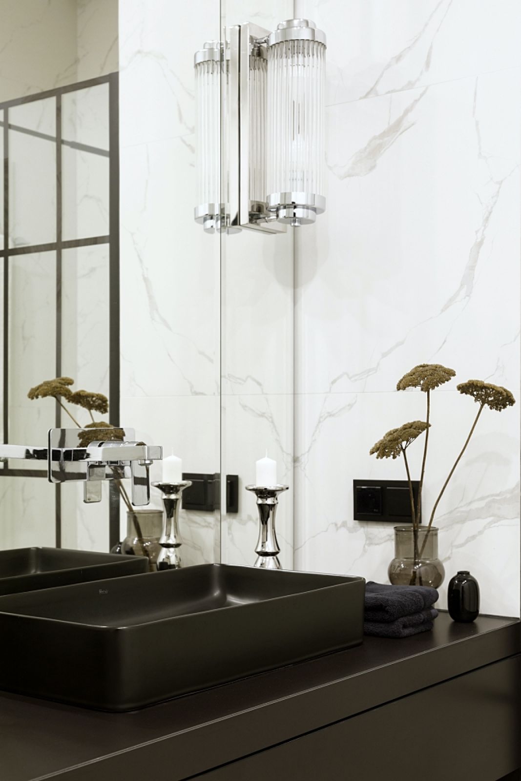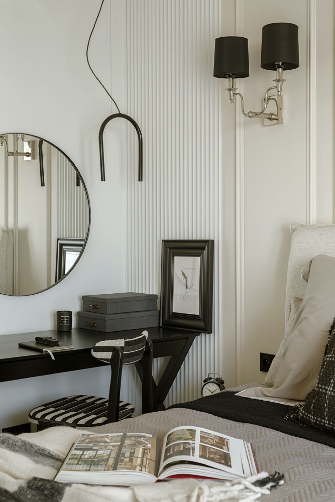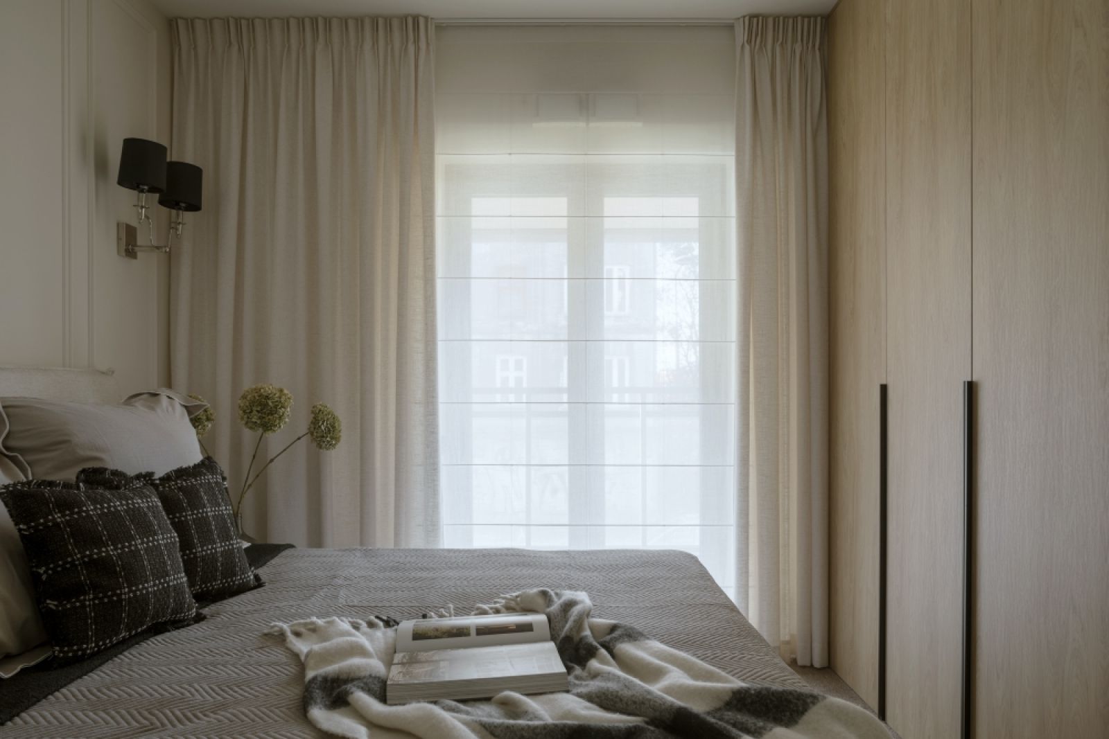 – Teraz mamy modę na bardzo kolorowe mieszkania, nawiązania do stylu Memphis – mówi Jonatan. – Ale każda moda mija i mój klient wolał nie hołdować trendom. Postawił na elegancję odporną na upływ czasu. Sypialnię chciał mieć urządzoną bardzo przytulnie, z miękką wykładziną na podłodze. A ponieważ poprzez przeszklenia i nieduży metraż jest ona otwarta na salon, to uszyliśmy też do dwóch innych pomieszczeń dywaniki z tej samej wykładziny. Estetycznie scalają całość.