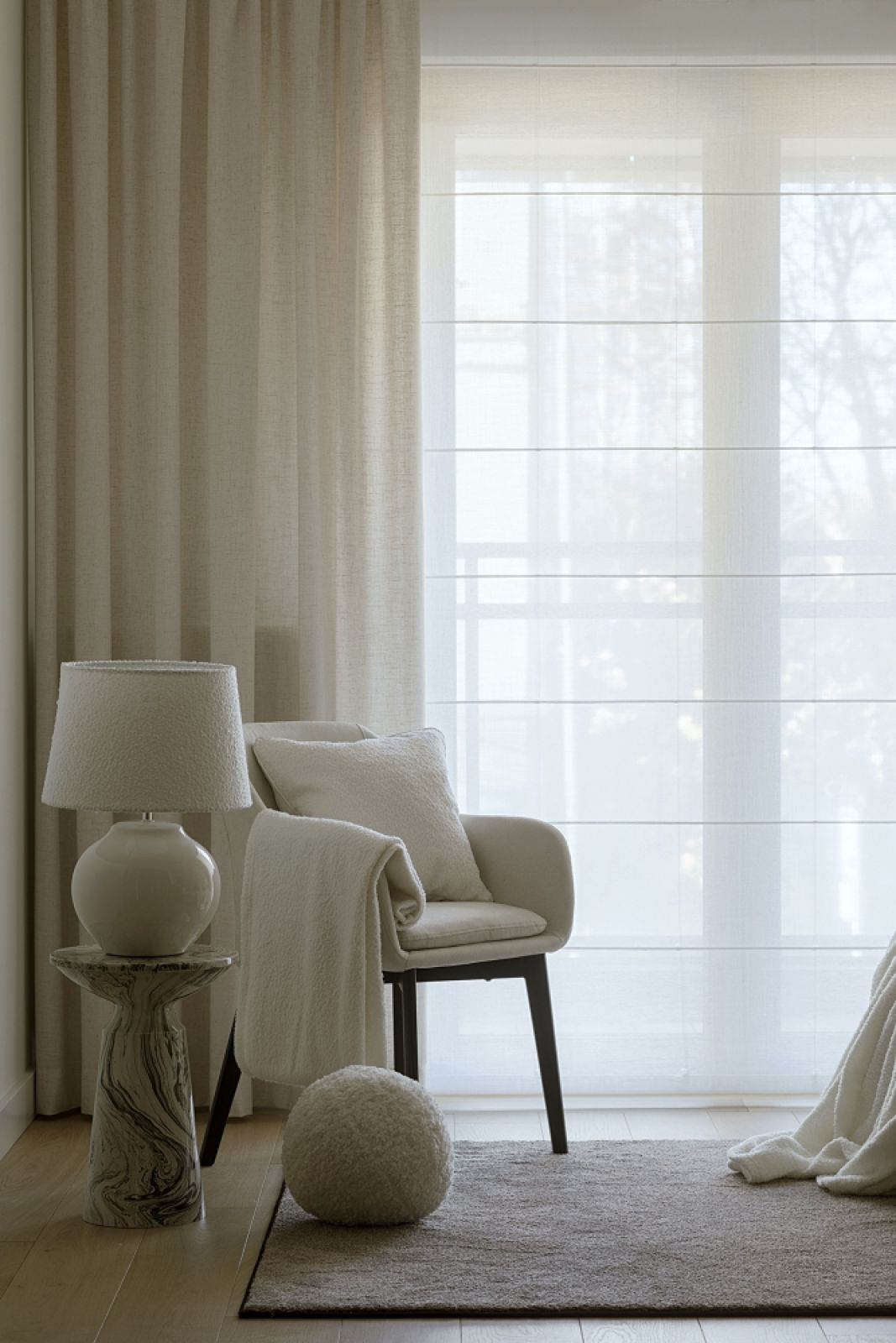 Jednym z najciekawszych rozwiązań, jakie tutaj zastosowano, jest salon, który nie ma własnych okien, ale „pożycza światło” z sypialni i gabinetu (a ten w razie czego można zamienić w drugą sypialnię). Pożyczka odbywa się poprzez wielkie przeszklenia oddzielające te dwa pomieszczenia od strefy dziennej. Za szkłem są zasłony, które – gdy zachodzi konieczność – można zasunąć.