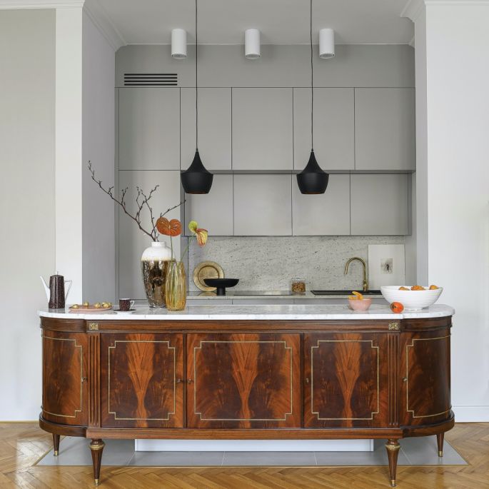 Małgorzacie Jaworskiej zależało na tym, by zachować równowagę między elementami stylowymi i nowoczesnymi oraz dopasować je do siebie. Zgrać zdobne meble i robioną na wymiar zabudowę. Centralnym elementem apartamentu stała się oryginalna wyspa kuchenna. Stworzono ją na bazie stylowego (prawdopodobnie belgijskiego) mebla – obszernej fornirowanej komody z miedzianymi okuciami przykrytej marmurowym blatem kuchennym. Stojąca na smukłych i złoconych nóżkach wyspa jest jednocześnie ekranem, który przysłania bardziej nowoczesny „półwysep” kryjący sprzęty AGD – lodówkę i piekarnik.