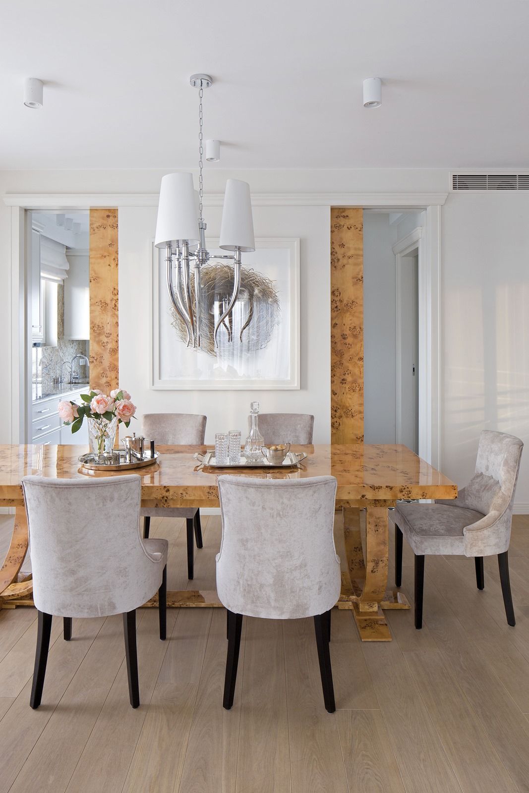 – Jestem architektką z polecenia – śmieje się Iza Rydygier, która wcześniej projektowała dom dla przyjaciół Anki i Adama. Kiedy do mieszkania weszła po raz pierwszy, nie była zachwycona, ale też zazwyczaj nie sugeruje się tym, co zastanie. Zaczęła od rozmów z właścicielami. Anka marzyła o szafie w każdym pokoju, opowiadała też, że nie przepada za zdecydowanymi kolorami i ceni szlachetne materiały. Chciała coś artdecowskiego, ale nie ciężkiego. Architektka wszystkie te pomysły narysowała w 3D. Jako główny akcent pojawił się materiał charakterystyczny dla tego stylu – czeczota. – Zdecydowałyśmy się na drewno brzozowe wybarwione na wpadający w pomarańcz kolor. Gdyby było blade, wyszłaby nam IKEA – mówi architektka. Czeczotowe są stół, komoda, serwantka z kryształowymi lustrami, nawet przesuwne drzwi – wszystko zaprojektowane do tego mieszkania. Wykonaniem zajął się Marek Bukowski, stolarz z Ełku. – To była praca! – dziewczyny nie mogą wyjść z podziwu. – Listki forniru miały nieraz po 30 na 30 cm, trzeba było je pięknie przykleić i zalać lakierem.