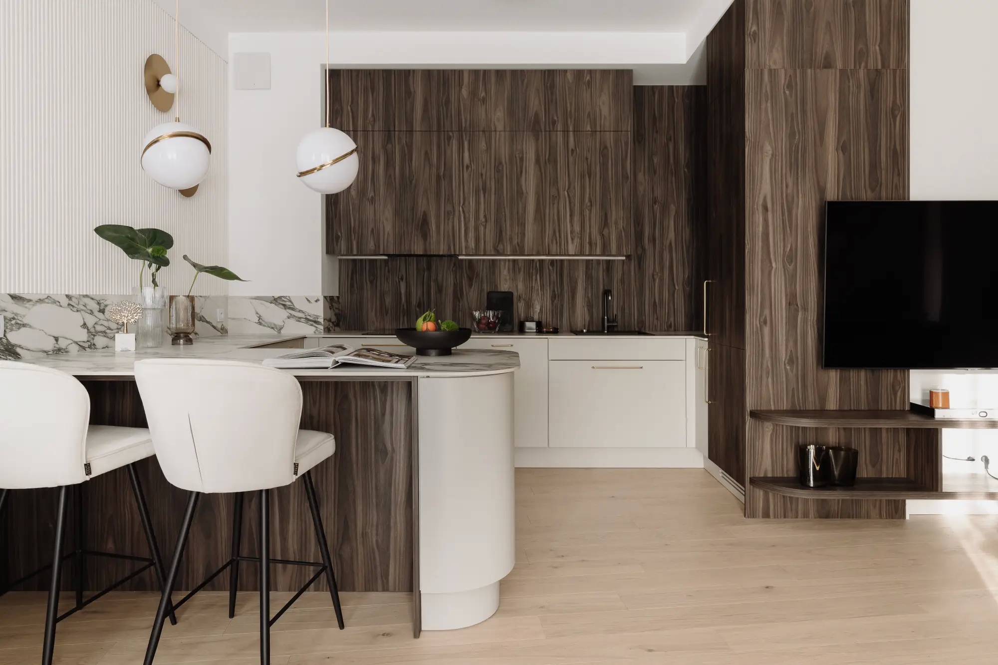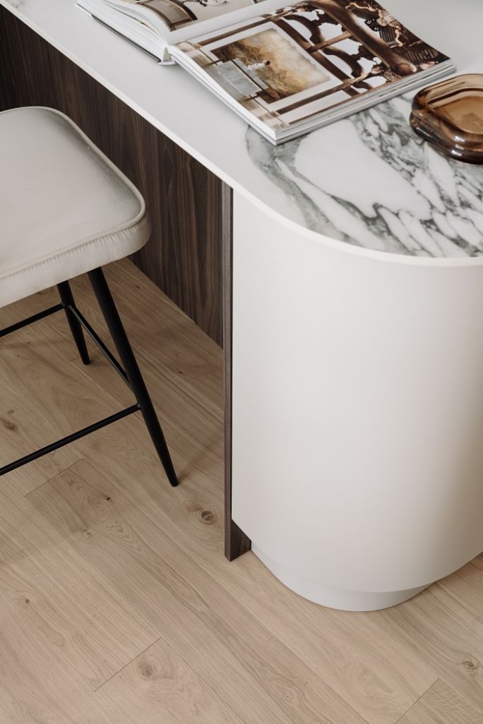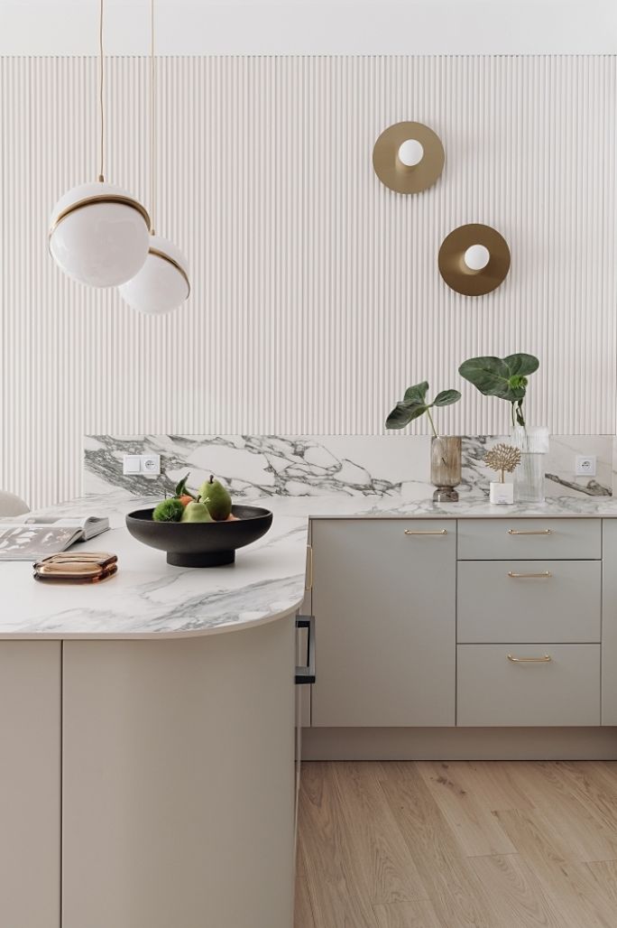 W mieszkaniu pokazowym KODO biel ścian przełamano pięknymi lamelami w odcieniu złamanej bieli. Do tego zastosowano kamienne blaty, dobrano nastrojowe tkaniny, np. długie, miękko spływające zasłony w przytulnym brązowym kolorze oraz pasujące do nich drewno.