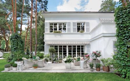 Już emaliowana tabliczka z adresem obok furtki przywodzi na myśl południowe klimaty. Dalej jest jeszcze dosłowniej: biała willa z gzymsami, duże żaluzjowe okiennice, markiza w pastelowe pasy i trawertyn na podłogach, który daje przyjemny chłód w upalny dzień, w końcu rosnące w kamiennych donicach różowe oleandry i werbena.