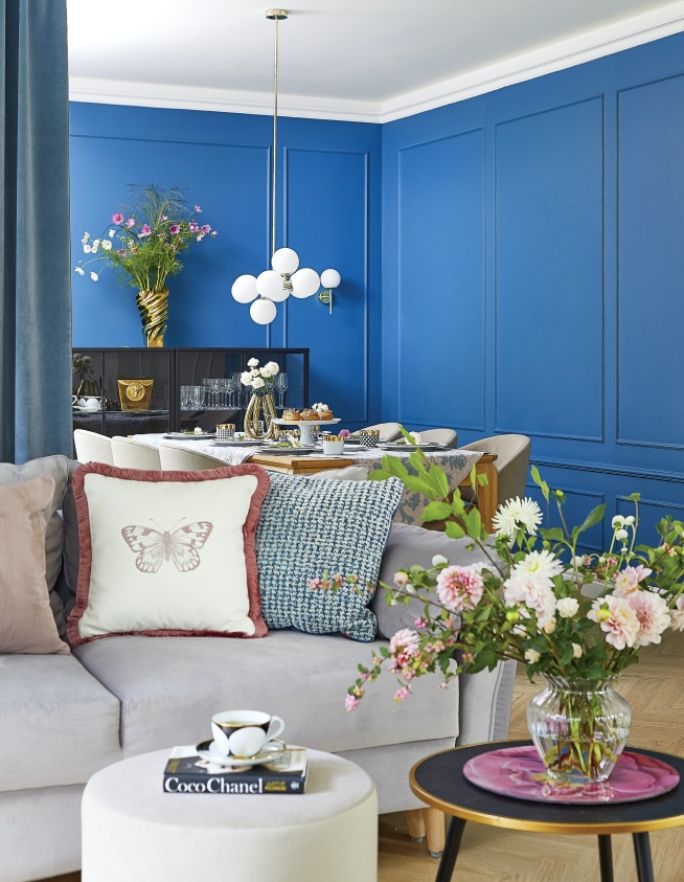 Pomysł na niebieski kolor ścian w jadalni przywieziony z Paryża
