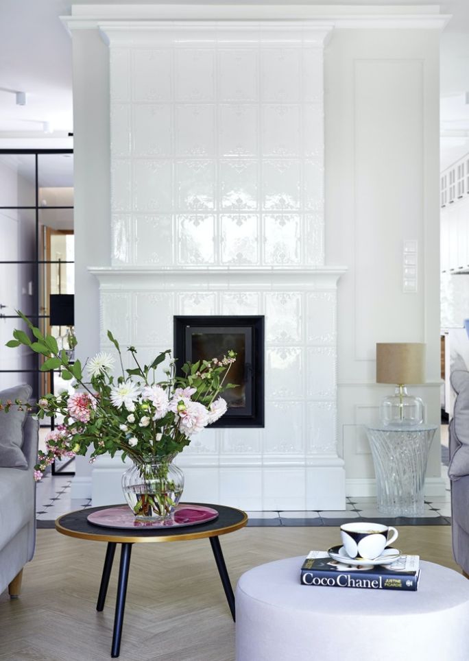 Dzięki piecowi salon stał się przytulny. Został zbudowany przez zduna z ręcznie wykonanych i szkliwionych kafli „Ogarek” w kolorze arktycznej bieli. Kafle przyjechały z rodzinnej manufaktury z Podlasia – kaflarni Kafel-Kar, kafel-kar.pl.