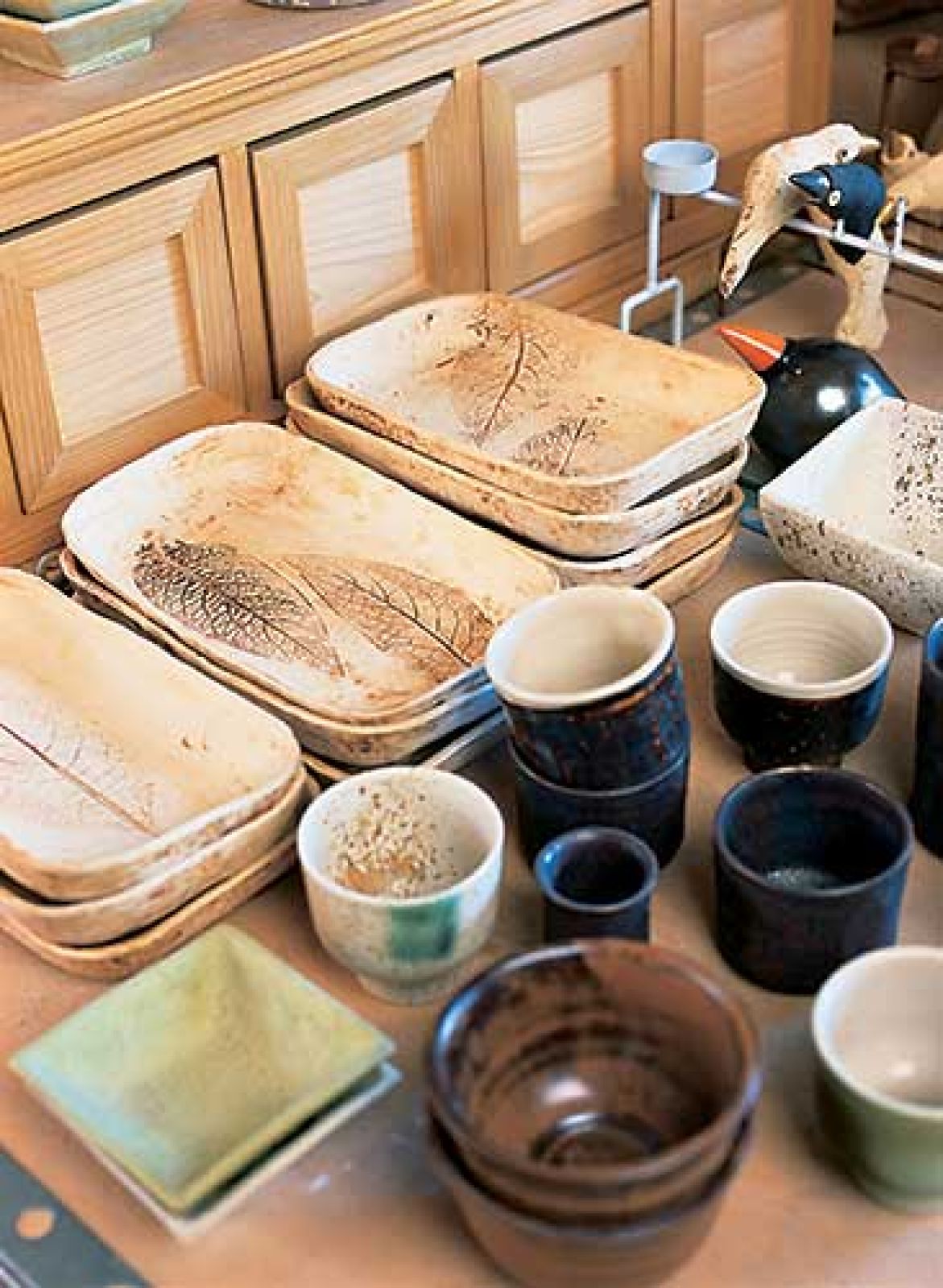 Od czasu do czasu Ewa przerzuca się więc na anioły i jednorożce. Podobają się, sprzedają, ale i tak pierwszą pozycję listy przebojów Budzowskich niezmiennie okupują ptaki. A tworzą przecież jeszcze ceramiczne mebelki, aniele skrzydła, podstawki, kolumny stylizowane na rzymskie i kafle. Jacek z kolei lepi „formy przemysłowe” – proste naczynia nawiązujące do kultury Wschodu. Wielkim sentymentem darzy też liście. – Już od dawna robimy talerze, miski oraz meble z tym motywem, który gdzieś wisiał w powietrzu i pewnego dnia się objawił.