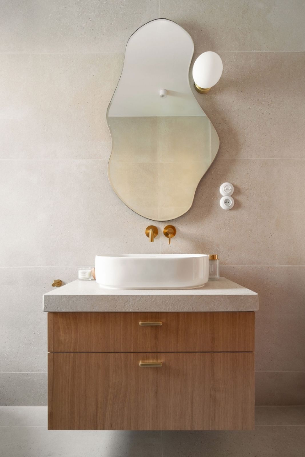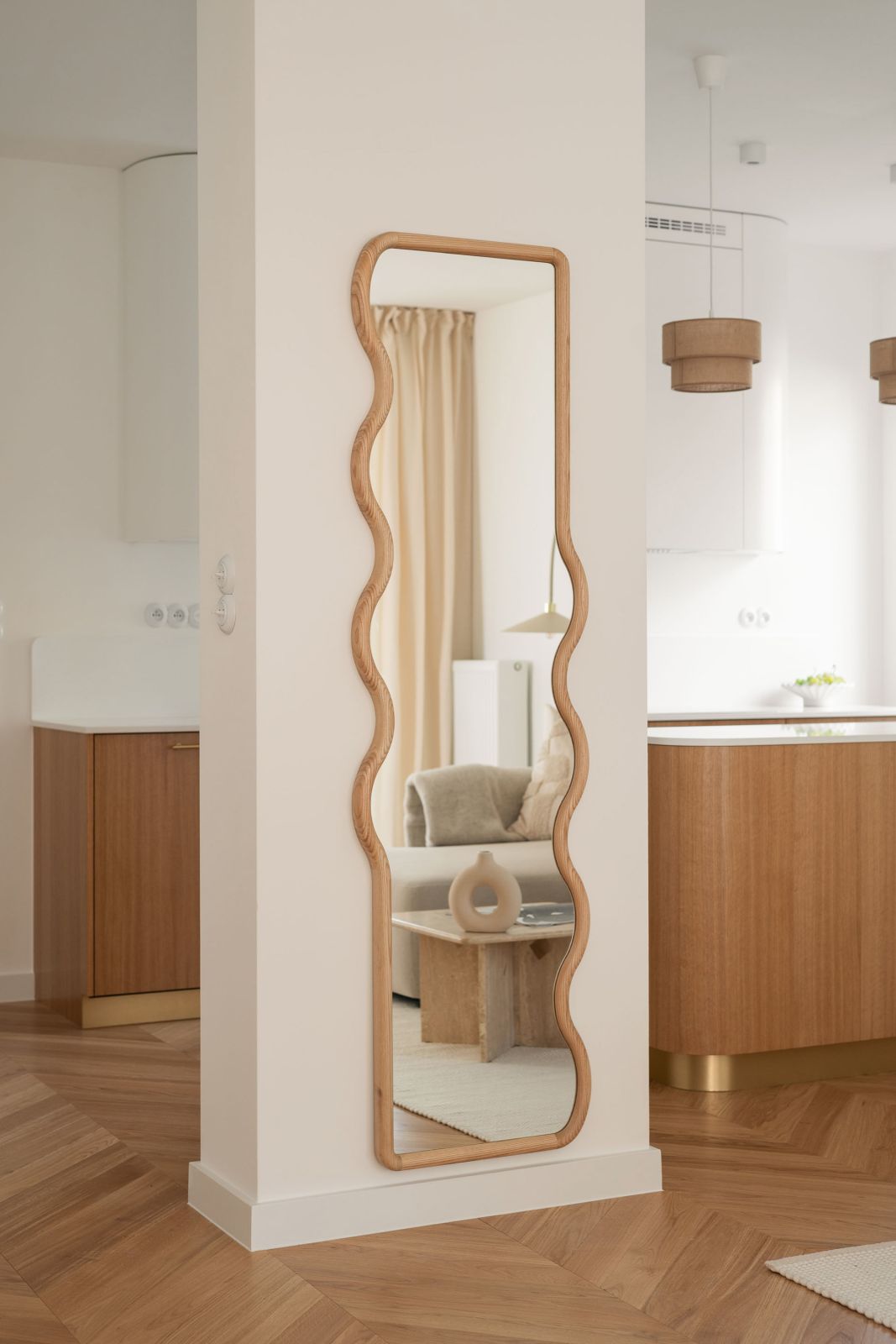 W łazience, jak w całym mieszkaniu, dominują opływowe kształty. Zaokrąglone ranty ma umywalka osadzona na blacie – pod nim zamontowano półki w dębowej okleinie, na podręczne kosmetyki, akcesoria i ręczniki. Wszystkie meble zostały wykonane z płyty pokrytej fornirem dębowym, tym samym, którego użyto również w kuchni. Elegancji łazienkom dodaje armatura w kolorze szczotkowanego złota, lustra o nieregularnych kształtach oraz obrazy z motywami roślinnymi.