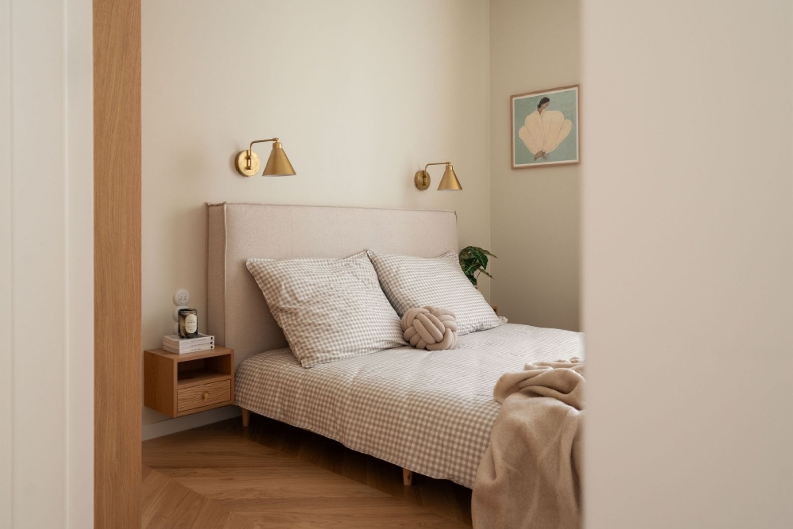 W takiej koszmary z pewnością się nie przyśnią! W centralnej części pokoju projektantka ustawiła duże, wygodne łóżko z miękkim tapicerowanym zagłówkiem, które zaprasza do odpoczynku. Flankują je po bokach dwie zgrabne nocne szafeczki – właścicielka lubi czytać przed zaśnięciem, miejsce, gdzie będzie mogła odłożyć książki czy telefon, było więc niezbędne. Kompaktowe mebelki z szufladkami lewitują nad posadzką odsłaniając estetyczne listwy przypodłogowe i piękny parkiet. Teraz, przy kameralnym świetle biżuteryjnych kinkiecików, opierając się o komfortowy zagłówek, inwestorka będzie mogła co wieczór oddawać się swojej pasji. W sypialni zmieściła się też duża szafa na ubrania. Beżowe ściany oraz naturalne tkaniny nadają pomieszczeniu przytulności, a dębowe meble nawiązują do tych znajdujących się w pozostałych częściach mieszkania.