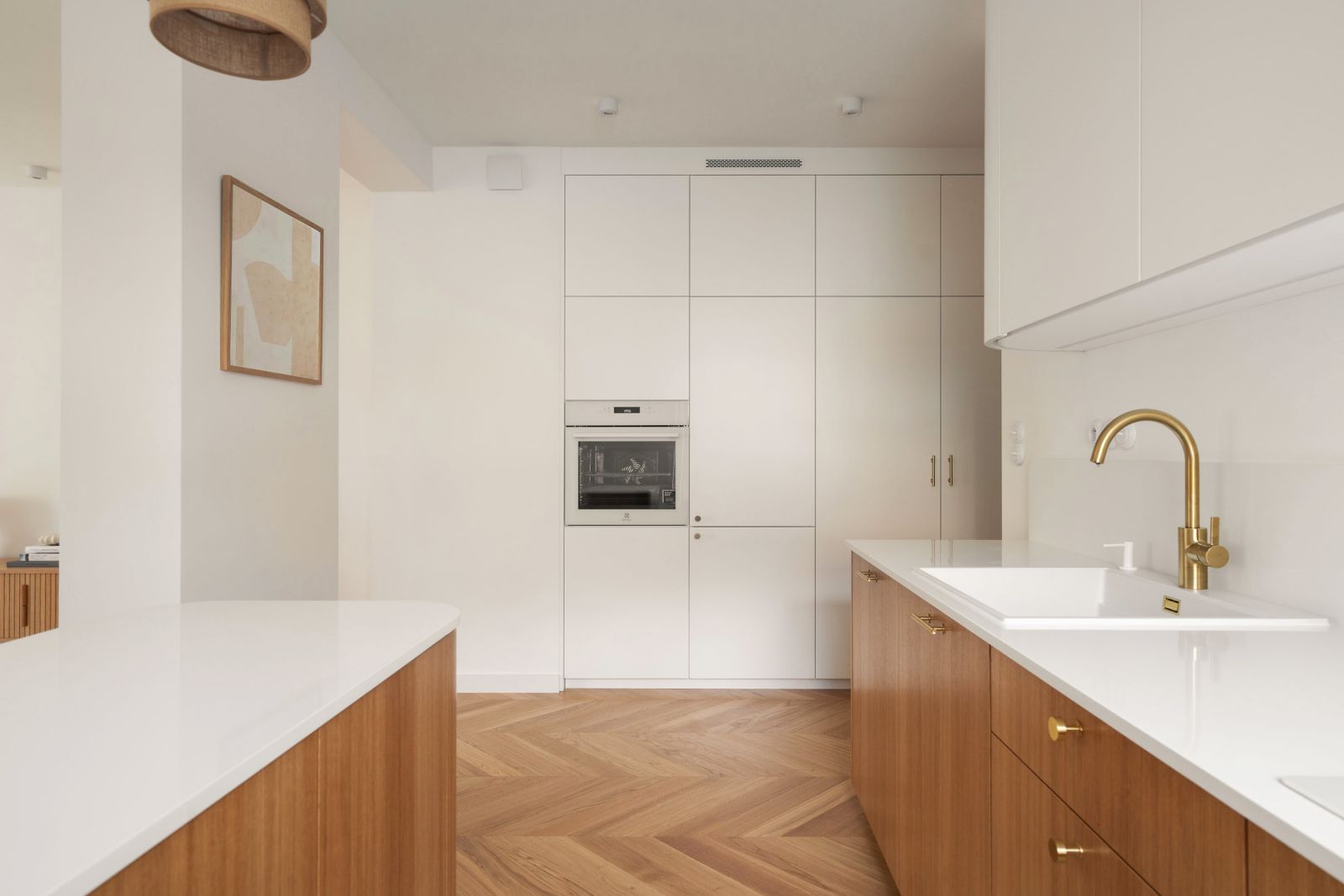 Meble kuchenne powstały z połączenia dwóch rodzajów frontów – białych, gładkich oraz tych wykonanych z forniru dębowego. Wykonał je na zamówienie zaprzyjaźniony stolarz. Dekoracyjnym detalem są złoty, szczotkowany cokół, który „odbija” szafki od podłogi i nadaje im wizualnej lekkości. Dopasowano do niego uchwyty oraz baterię przy zlewie. Elegancji dodaje kuchni blat z białego konglomeratu – pięknie wygląda i jest bardzo wytrzymały. Spuszczono nad niego (w części wyspowej) dwie lampy zrobione ze sklejki – ich kolor udało się idealnie dobrać do odcienia forniru. W całym mieszkaniu ułożono we francuską jodełkę piękny dębowy parkiet – dzięki niemu strefa wspólna nabrała jeszcze więcej przytulności i szyku.