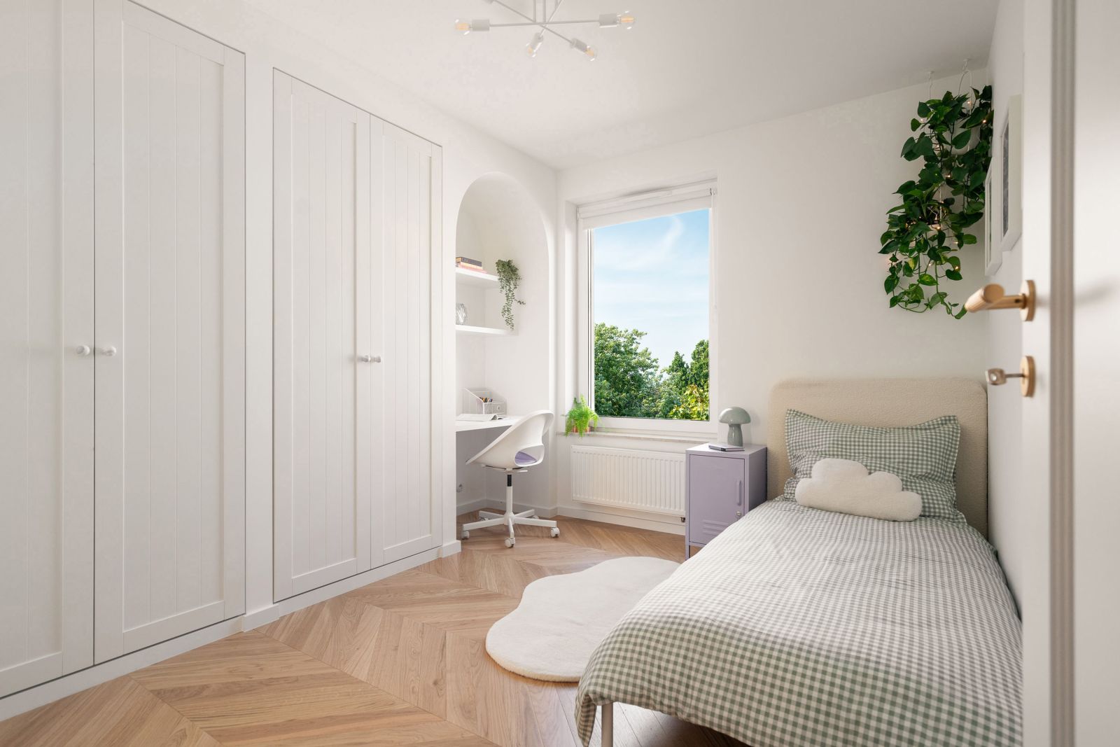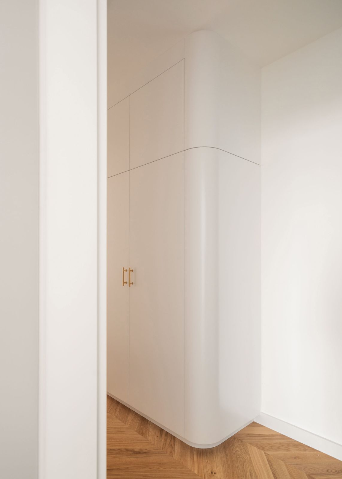 Znajduje się w drugiej sypialni. Na prośbę młodej lokatorki została ona urządzona w nieco romantycznym stylu. Biała zabudowa, z pojemną szafą i dużym biurkiem, kojarzy się z dawnymi sekretarzykami. Może za sprawą pomysłowej niszy, wykończonej górą eleganckim łukiem, w którą sprytnie wsunięto blat do pracy oraz półki na książki.