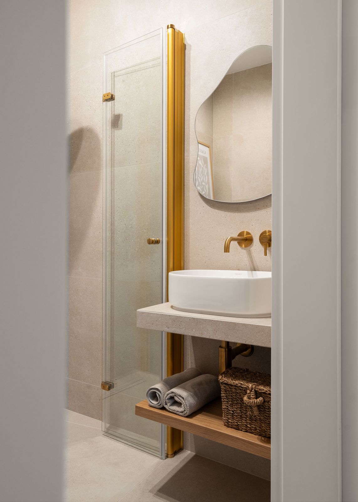 Część natryskową oddziela od reszty łazienki przezierna szyba, która składa się jak harmonijka pozwalając zaoszczędzić miejsce i optycznie dodając lekkości. Duża deszczownica w mosiężnym kolorze pozwala zrelaksować się pod strumieniem wody.