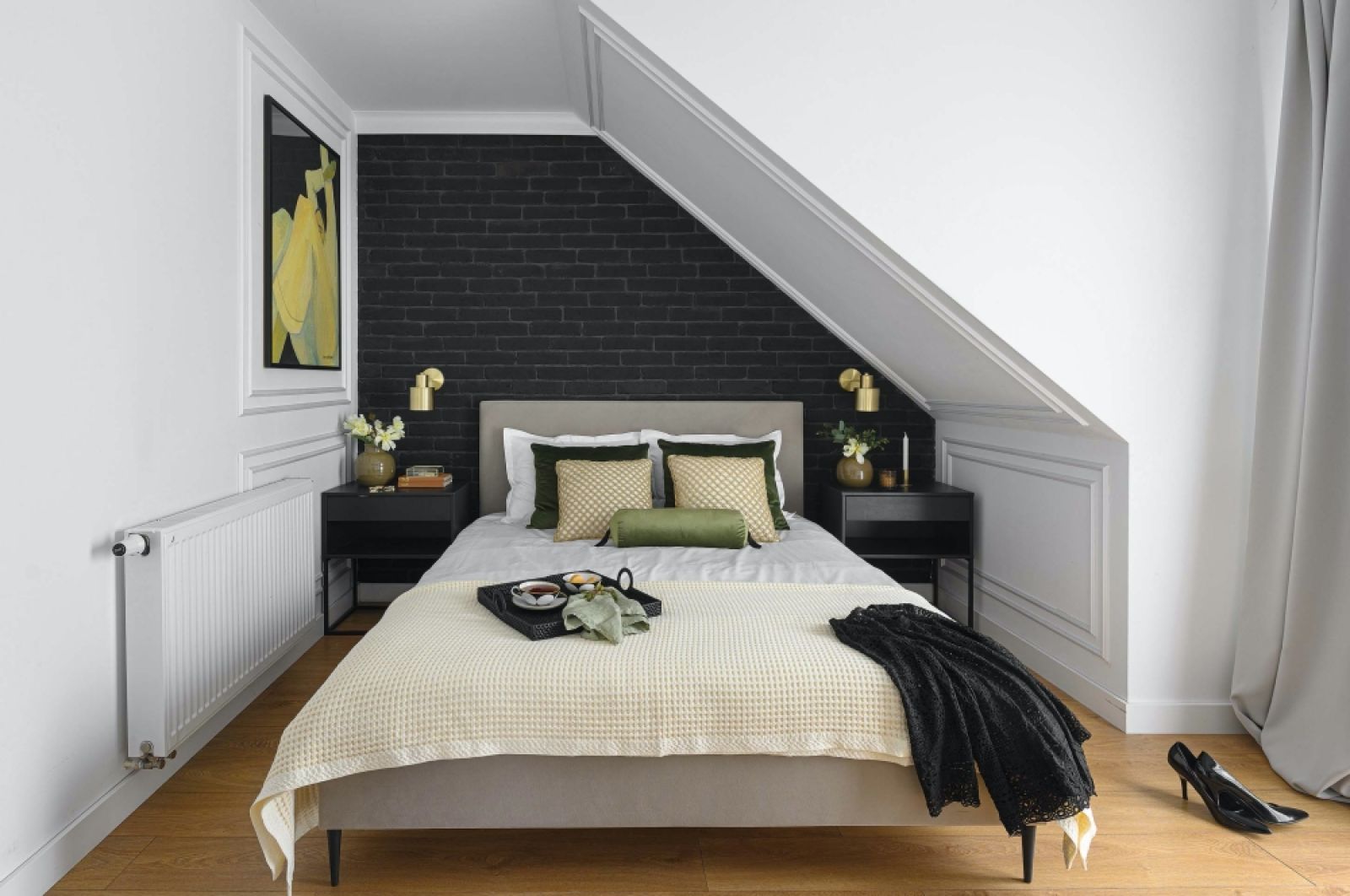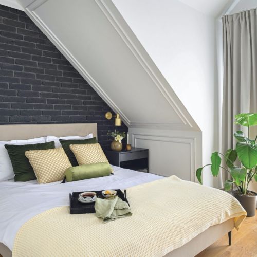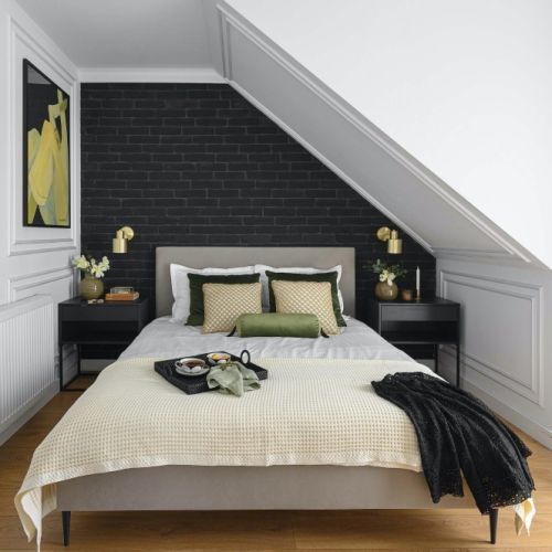 Metamorfozę przeszła też sypialnia, gdzie za łóżkiem pojawiła się czarna cegła. – Licówkę położyłam i fugowałam sama – opowiada – to była taka szybka weekendowa przemiana! Nieoczywistym rozwiązaniem jest sztukateria położona na skosach w sypialni. Eleganckie wnętrze ocieplają złote kinkiety, a przytulności dodają welurowe poduszki.