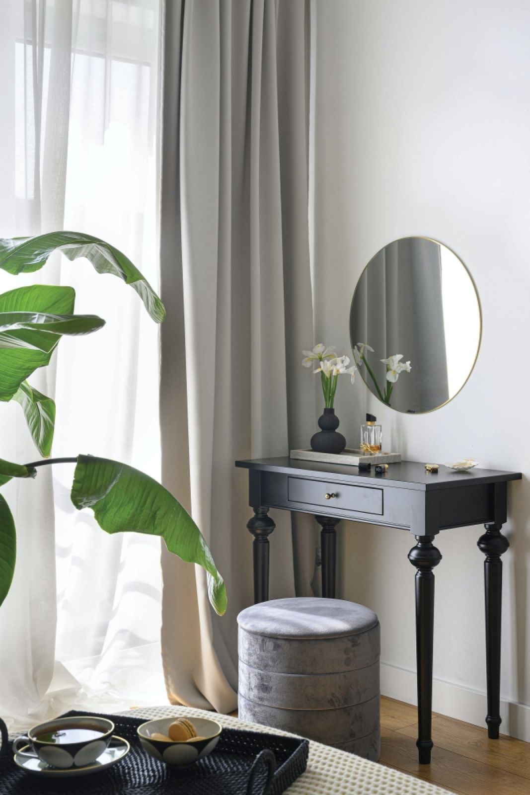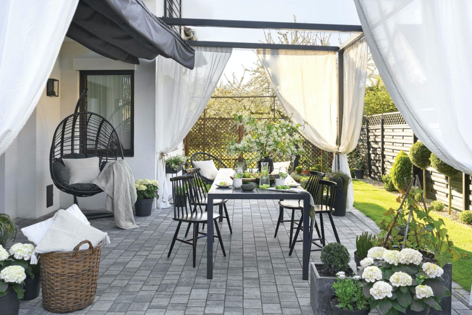 Czemu akurat te barwy? Bo czerń jest męska, a biel kobieca, bo to klasyczny i ponadczasowy duet. I wreszcie: bo dla Darii to idealne połączenie, które nigdy się nie nudzi. – Nie wiem, dlaczego tak jest, ale zawsze uwielbiałam to połączenie kolorów – opowiada. – Zbieram piękną czarno-białą porcelanę, nawet nasz ogród jest black and white – podsumowuje. I rzeczywiście – czarny płot, czarna markiza, białe kotary i kwiaty w donicach tworzą niecodzienną, ale wpadającą w oko kombinację. – Po prostu przeciągnęłam salon na zewnątrz, ogród to jego przedłużenie – zauważa Daria. – W ładne dni otwieram drzwi na oścież i siadam z herbatą oraz książką na zewnątrz. Wśród czerni i bieli oczywiście!