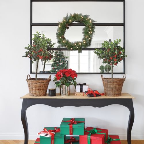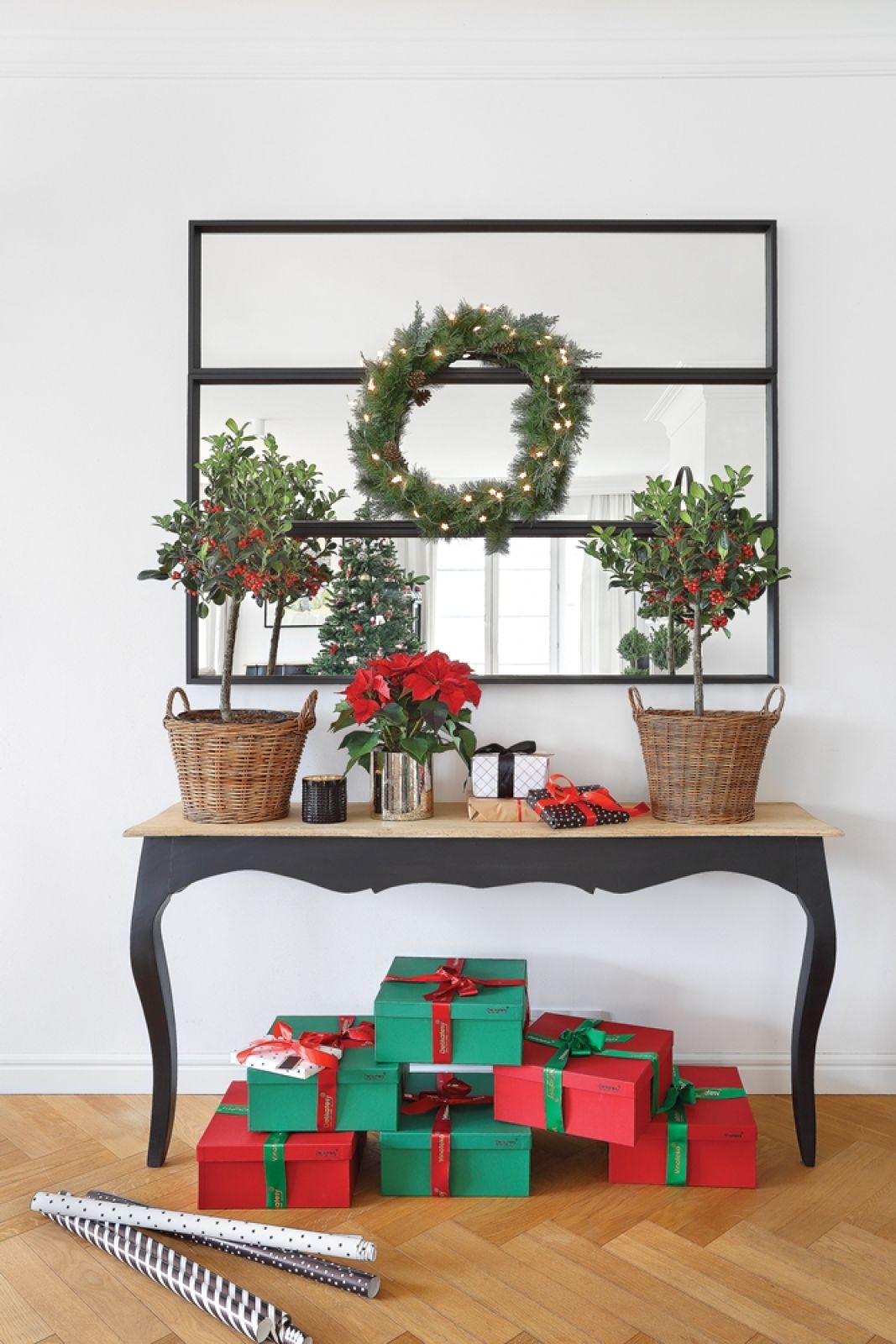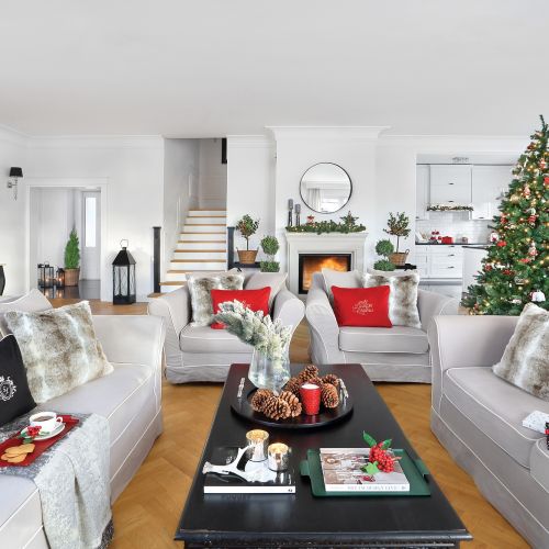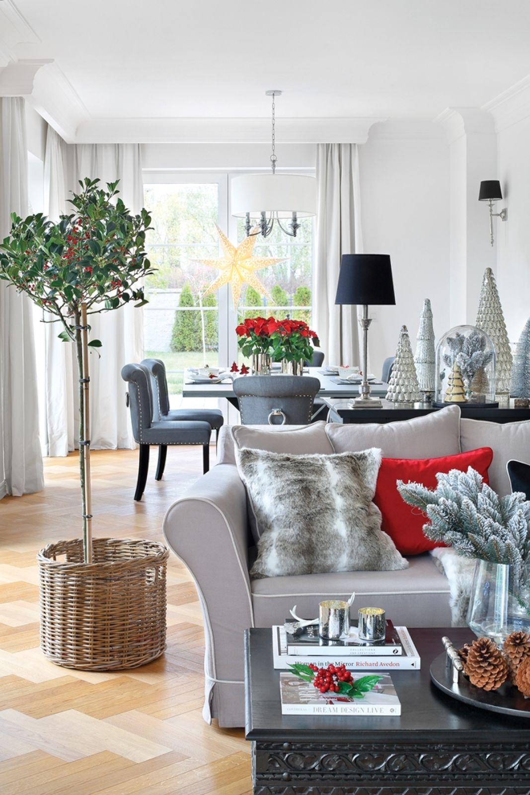 W salonie zawsze stoi wielka, pięknie udekorowana choinka, a w donicach mniejsze iglaki i laurowe drzewka. Na schodach wiszą zielone girlandy, na kominku zaś, angielskim i amerykańskim zwyczajem, skarpety na prezenty. Bo właścicielka kocha amerykańskie wnętrza i tamtejsze święta – efektowne, rozświetlone lampkami i gwarne. Ale z polskim akcentem.