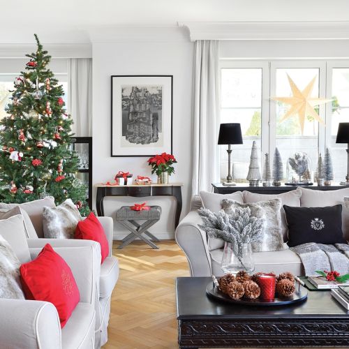 Czerwono-srebrne dekoracje na Boże Narodzenie we wnętrzach urządzonych w nowojorskim stylu