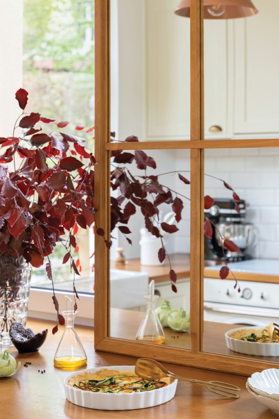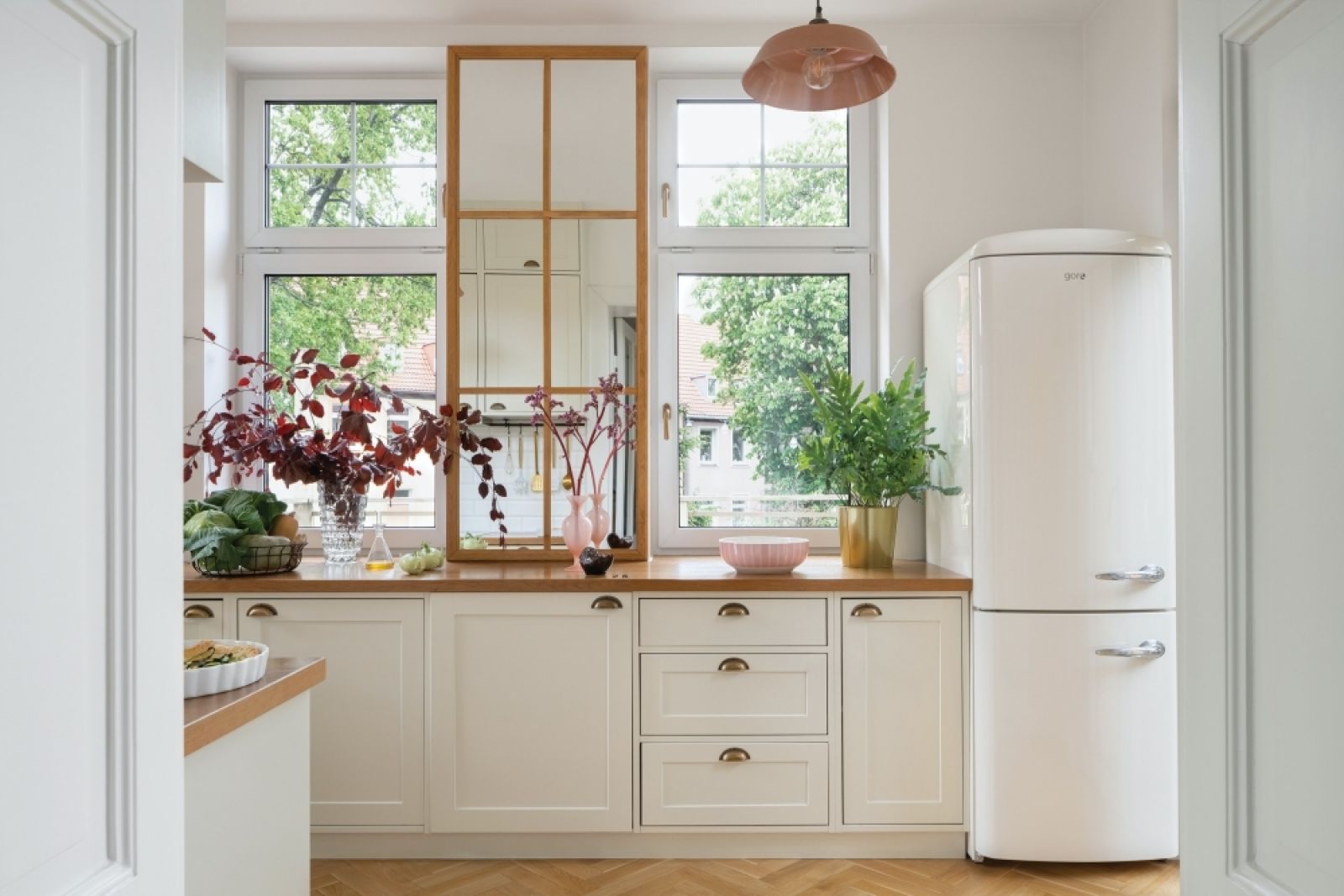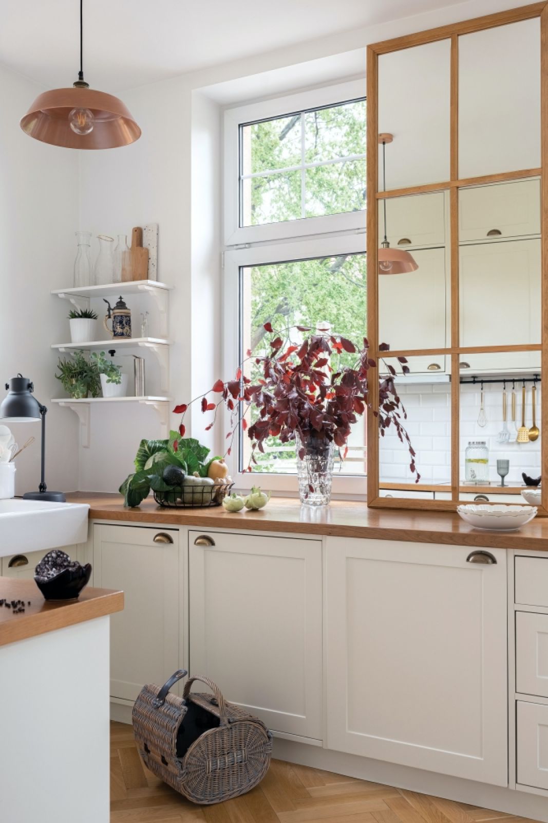 Niewielki korytarzyk z biblioteczką oddziela część dzienną od sypialni. Salon i kuchnia pozostały tak, jak je zastali. Ta ostatnia jest szczególnie ciekawa, bo znajduje się na werandzie willi i można z niej bezpośrednio wyjść na taras i do ogródka. – Zakochaliśmy się w niej od razu i prawie nic tu nie zmieniliśmy, poza pomalowaniem ścian oraz wymianą uchwytów w oknach – mówi właścicielka.