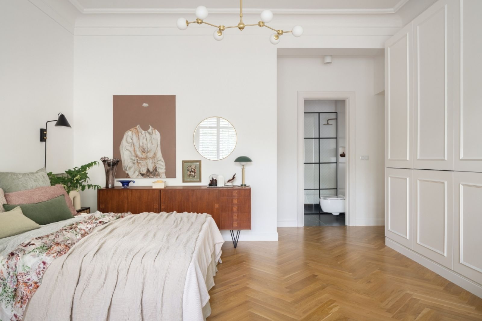 W willi zachowała się część podłóg, sztukaterie i wewnętrzna stolarka. Niestety nie udało się uratować pięknych drewnianych podłóg w sypialni. Wszystko to wskazuje na pozostałości eleganckiego, nieco chłodnego niemieckiego stylu. Zbudowany przez poprzednich właścicieli na miejscu starego pieca kaflowego piecokominek również odbiegał stylem od paryskich inspiracji. Tak oto wizja wnętrza przesunęła się bardziej w stronę nordyckich klimatów i smaczków. Marta przyznaje, że ma słabość do stylu mid-century, ale generalnie lubi wszelkiego rodzaju stylowe miksy i eklektyzm. Najważniejsze to stworzyć dobrą bazę, a potem już można mieszać i łączyć.