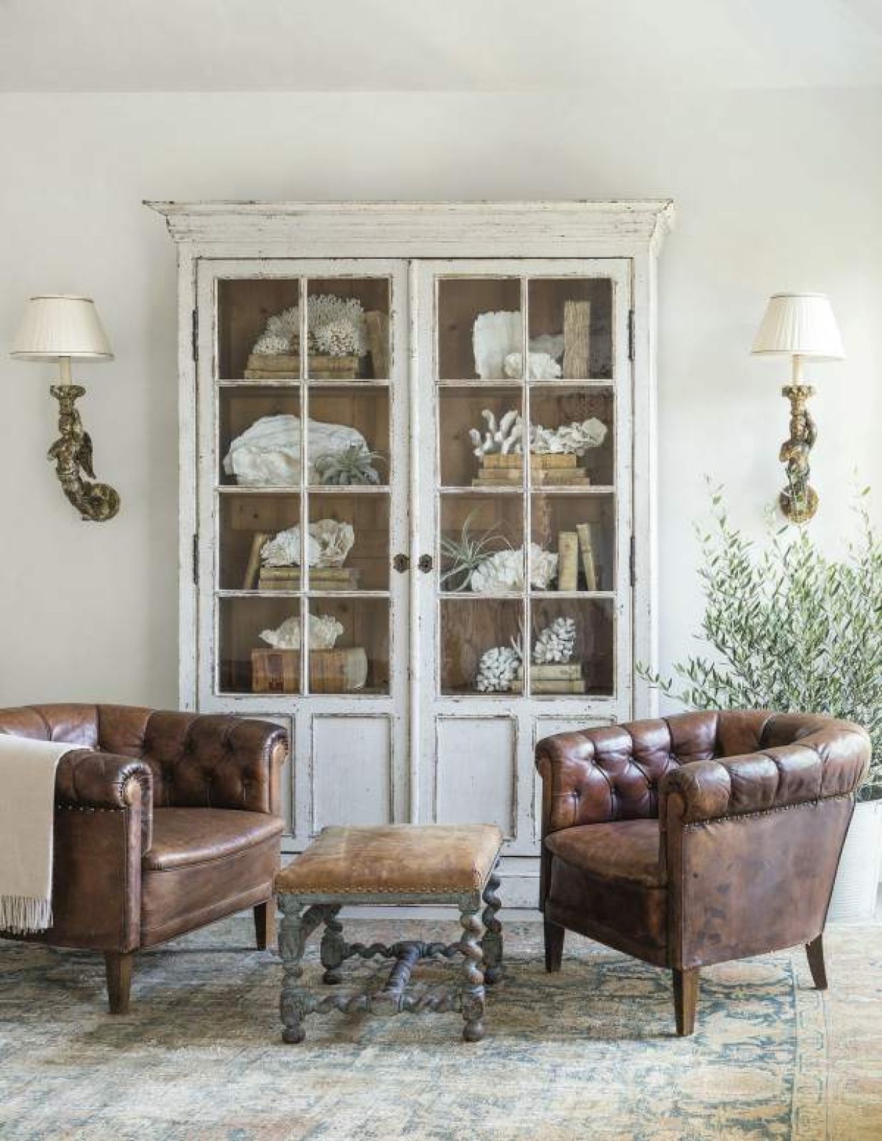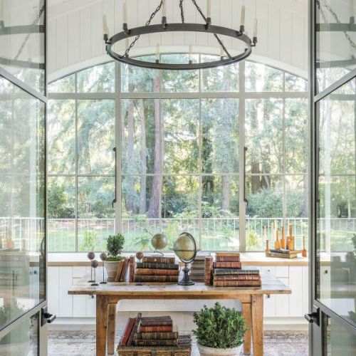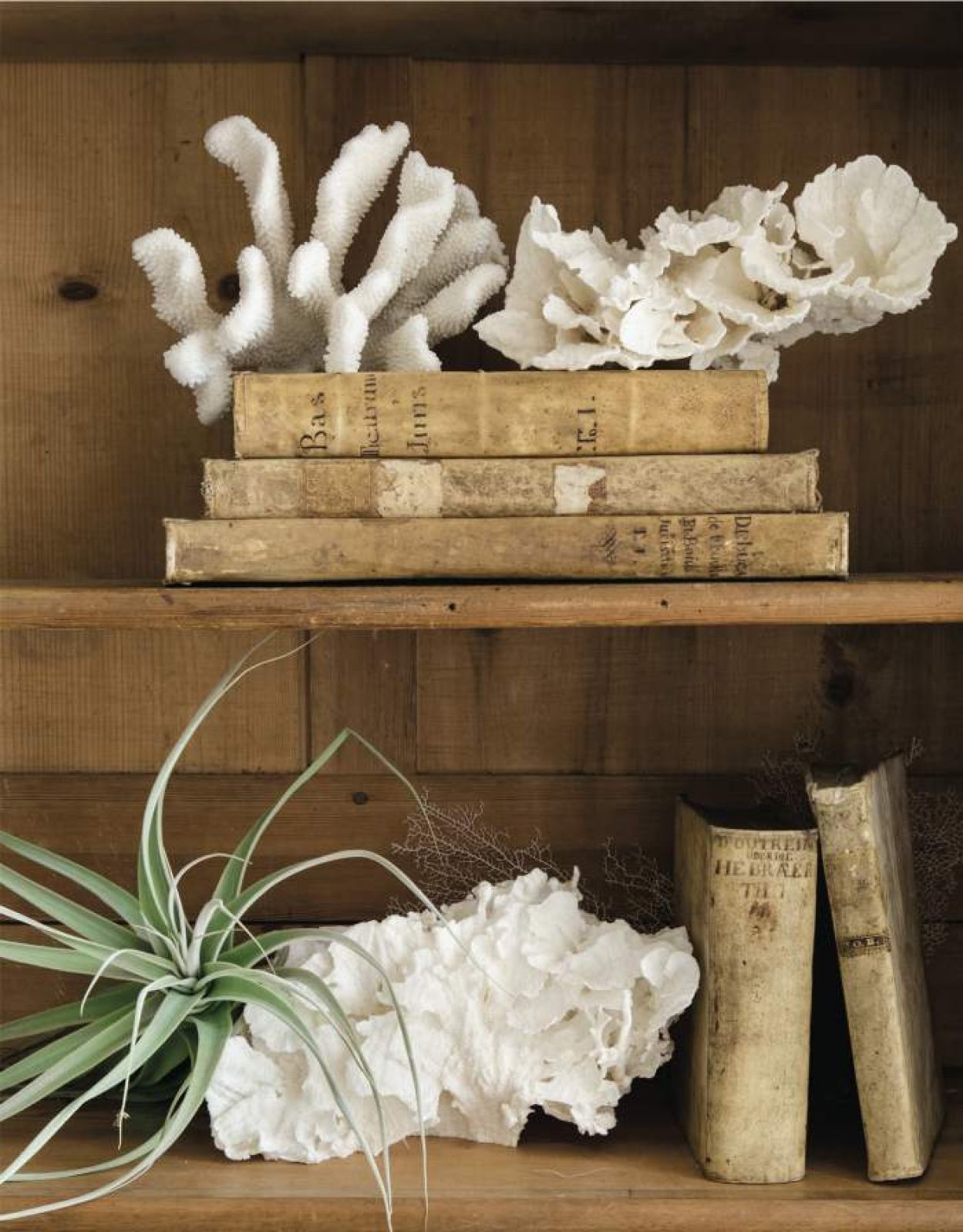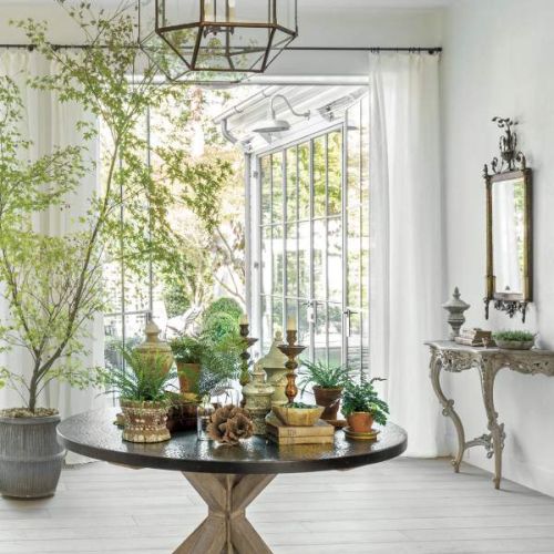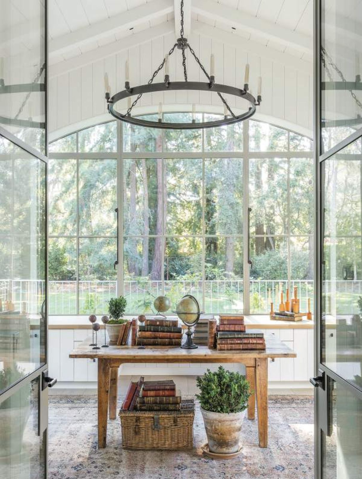 We wnętrzu zaprojektowanym przez Brooke dominują naturalne materiały: drewno, płótno, skóra. Wśród nich kolekcja korali gospodyni, fotografie, książki i parę mebli ze starego domu. Do nich Brooke dodała meble: francuskie i belgijskie antyki. I jeszcze zieleń. Razem ze Steve’em wierzą, że najlepsze wnętrza to takie, które wpuszczają ogród do środka. Stąd mocno przeszklone ściany i dużo roślin w donicach.