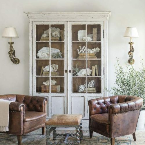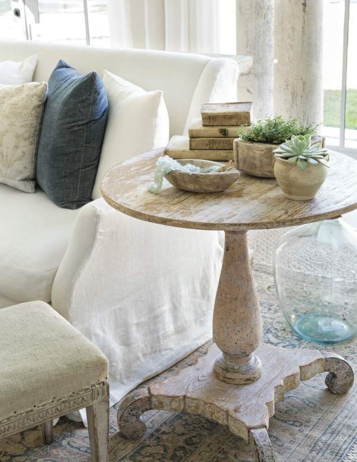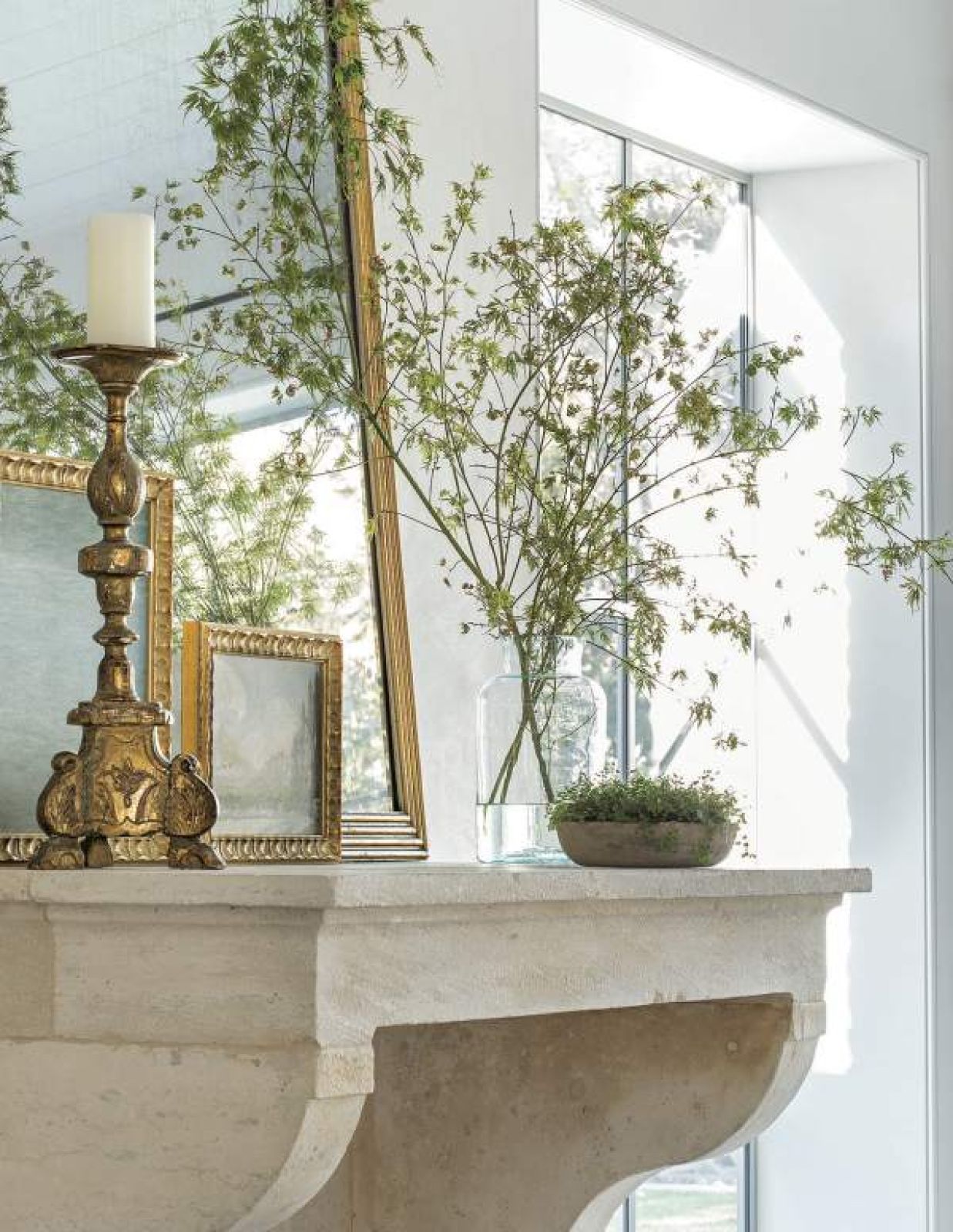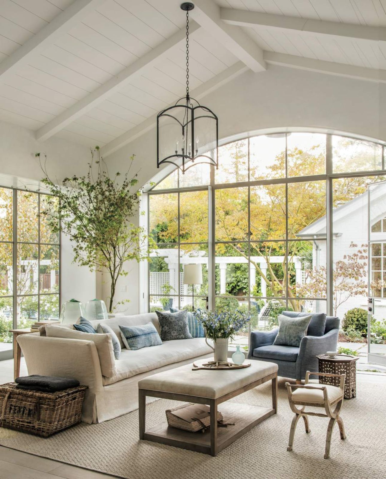 We wnętrzu zaprojektowanym przez Brooke dominują naturalne materiały: drewno, płótno, skóra. Wśród nich kolekcja korali gospodyni, fotografie, książki i parę mebli ze starego domu. Do nich Brooke dodała meble: francuskie i belgijskie antyki. I jeszcze zieleń. Razem ze Steve’em wierzą, że najlepsze wnętrza to takie, które wpuszczają ogród do środka. Stąd mocno przeszklone ściany i dużo roślin w donicach.