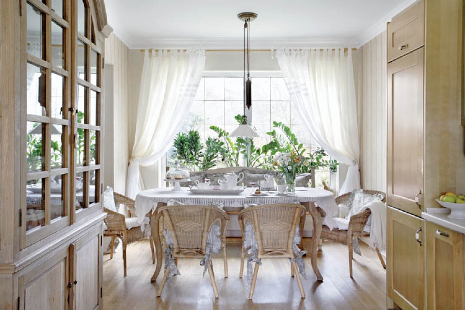 Kuchnia w subtelnym zielonym kolorze była robiona na zamówienie przez znajomego stolarza – według zdjęcia z pięknego albumu o pejzażach i domach w Prowansji. Jest kopią prawdziwej włoskiej kuchni. W jadalni meble ze starzonego bielonego dębu. Prosty ciężki stół, a przy nim rattanowe ogrodowe fotele wyściełane miękkimi poduchami.