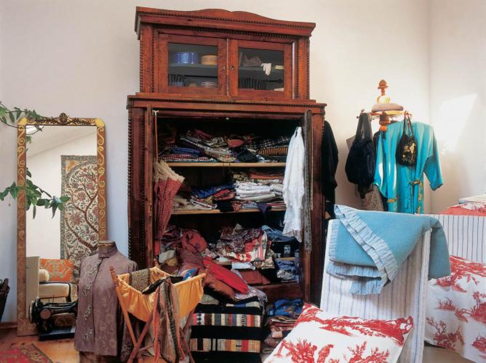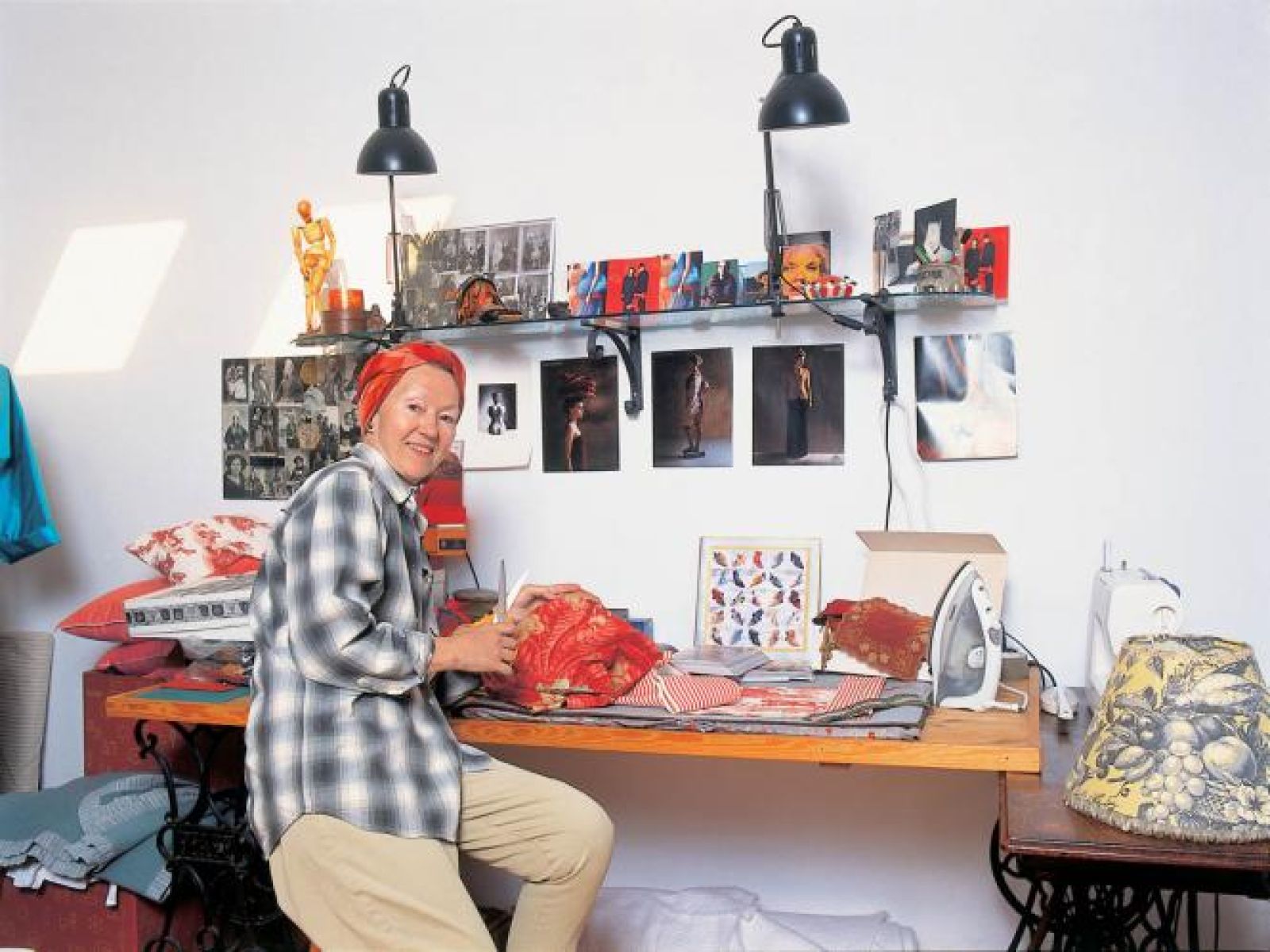 Jej pracownia w podwarszawskim domu musi pomieścić nawet trzymetrowe stelaże, na których rozwieszone są patchworki. Skrawki materiałów trzyma w XIX-wiecznej szafie, którą znalazła kiedyś w antykwariacie w Konstancinie (dziś już nie istnieje). Na podłodze walają się ścinki tkanin, przez oparcia krzeseł przewieszone są zasłony z odzysku, na manekinach wiszą ubrania.