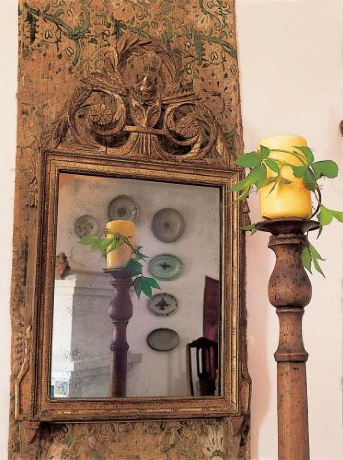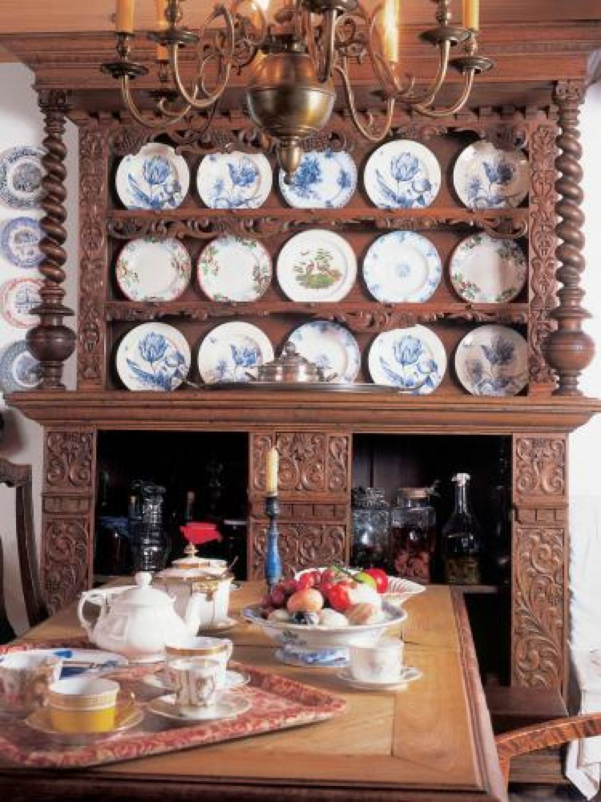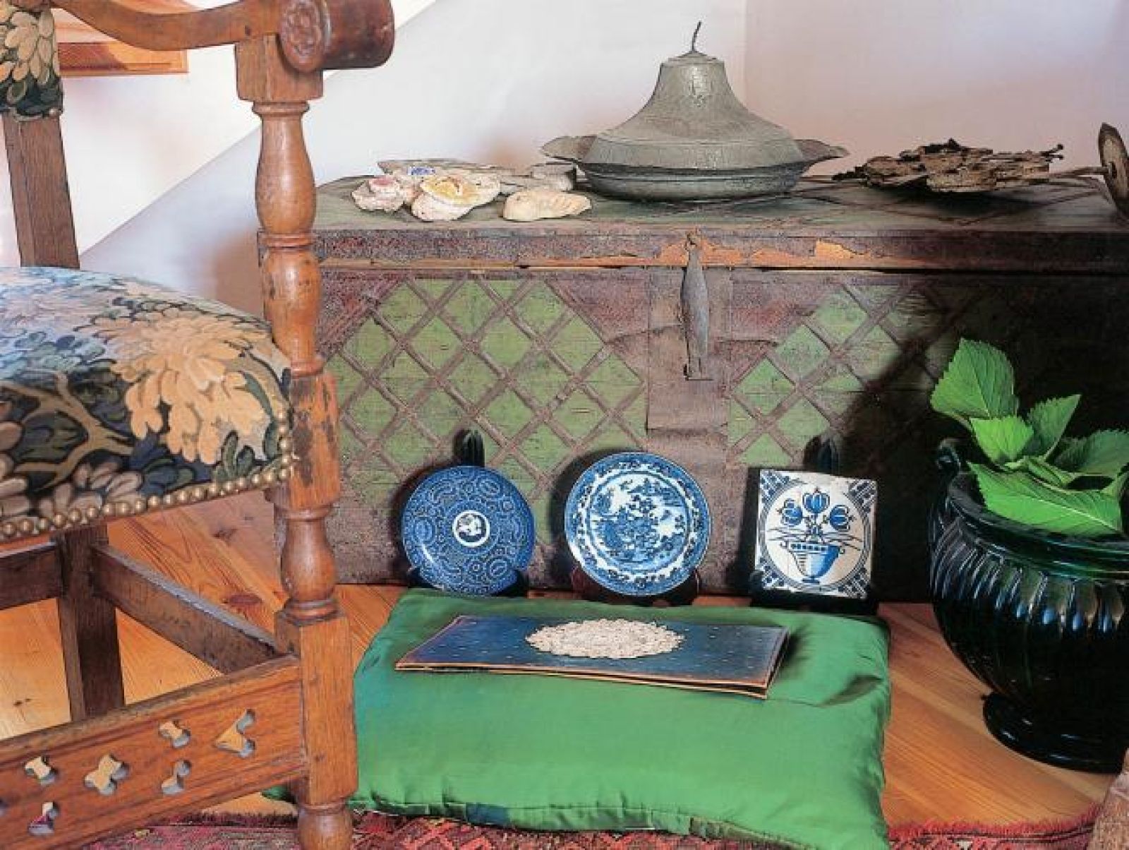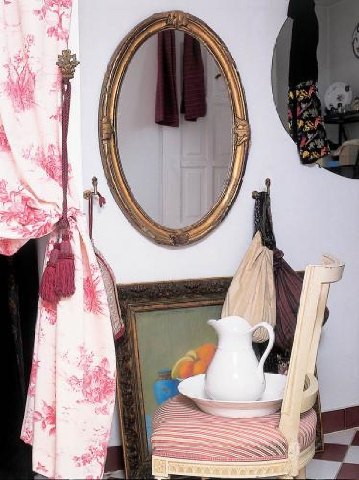Obok biurka postawiła fotel obity tkaniną z manufaktury Aubusson, a czerwony żakard na ścianie wypatrzyła na paryskim pchlim targu. Są też fajansowe talerze z manufaktury w Rouen – sinoszare, z grubym ciemnobrązowym dnem, a pośrodku koronkowym wzorem, francuskie lustro, niebieska malowana szafa. – Lubię rzeczy przeorane przez czas i tylko z naturalnych materiałów – tłumaczy Bożena.