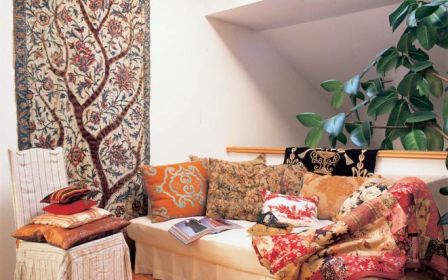 Gotowe poduszki i pledy zdobią kanapy. – Patchworkiem może być tak naprawdę wszystko: obicie fotela, kotara, obraz na ścianie – tłumaczy artystka. – John Galliano i Christian Lacroix wykorzystują patchwork w projektowanych przez siebie ubraniach. To filozofia życia. Patchwork przypomina też dom Bożeny. Meble i przedmioty pochodzą z różnych epok i miejsc. Kuchenny stary kredens to prezent od Franciszka Starowieyskiego, z którym się przyjaźniła.
