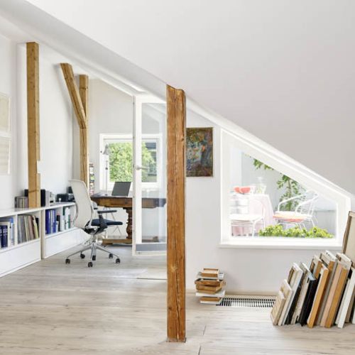 Dla malarza najważniejsza jest pracownia. Nieczęsto zdarza się, żeby współtworzyła mieszkanie – jak u Zakrzewskich. Bo u nich atelier wyznacza oś północno-południową domu. Otwarta przestrzeń mierzy 70 metrów, płynnie przechodzi w living room z kanapą, fotelami i telewizorem. Sztalugi zostały ustawione w północnym krańcu pomieszczenia, a część relaksowa – od południa. Granica to regał z książkami, na tyle niski, że nie przeszkadza spacerom światła. Najwięcej dookoła obrazów Włodka. W pracowni, livingu, kuchni, bibliotece.