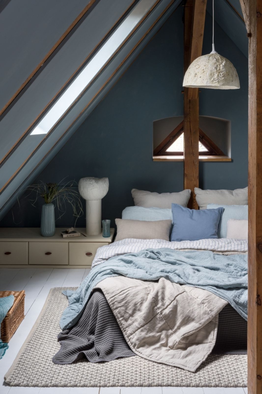 Joanna dodała swoje zmiany: przeniosła wejście w kuchni, poprzestawiała kilka ścian. Wygospodarowała dwa pokoje dziecinne i garderobę, a na poddaszu urządziła sypialnię z otwartą łazienką. – Zależało nam na funkcjonalności i wygodzie – opowiada – oboje pracujemy w domu, musimy się tu dobrze czuć, także wtedy, gdy wypoczywamy.