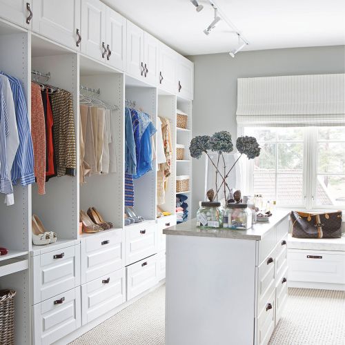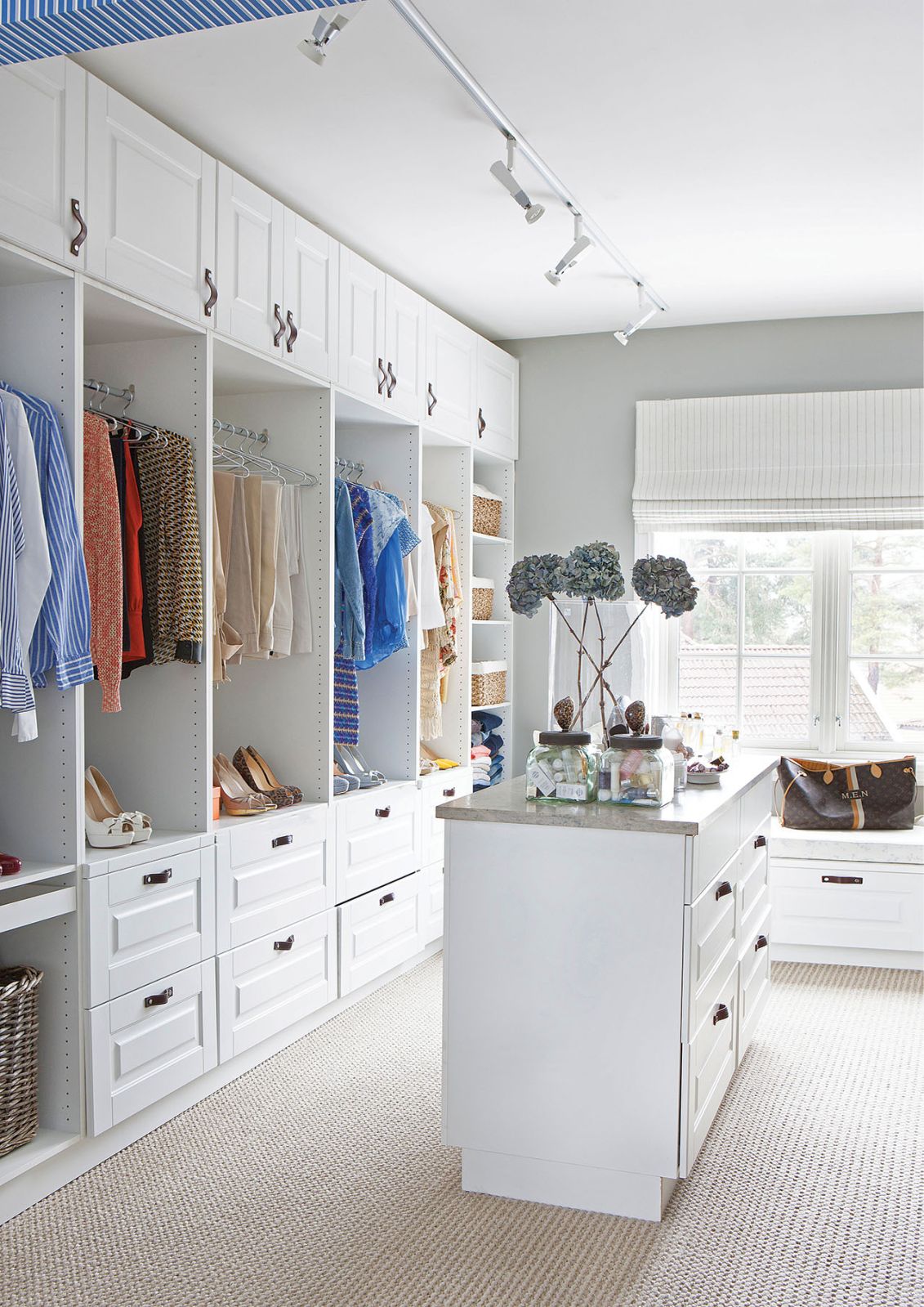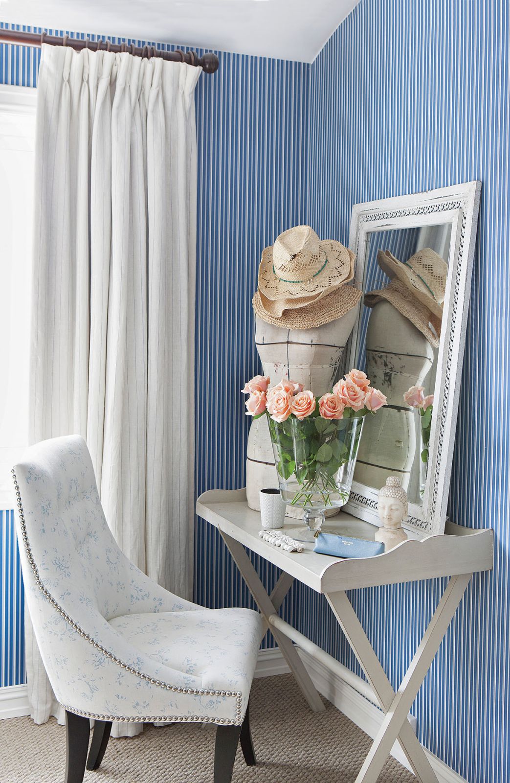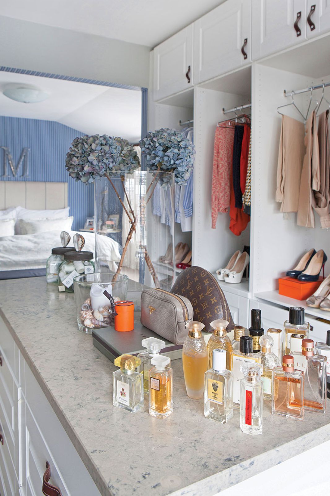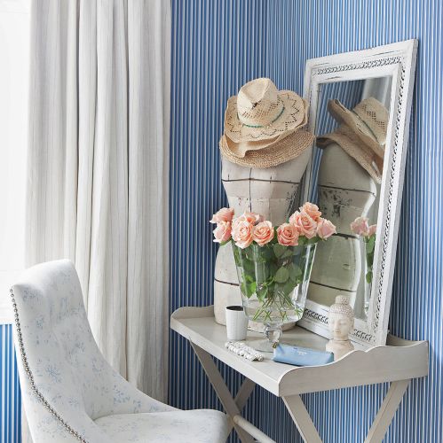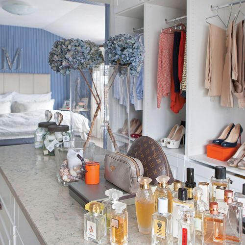Całą ścianę zarezerwowała na ulubione lustro Konstelacja zaprojektowane przez Thomasa Pheasanta, a przy kominku stanął ogromny fotel do czytania. Swoją sypialnię urządziła bardziej po babsku – z jutową wykładziną, tapetą w drobne paski i wystawką na stoliku – przypominającą o wszystkim, co lubi. Jest tu więc głowa Buddy – to pamiątka z podróży, krawiecki manekin – Maria uwielbia modę, wazon – to na ukochane herbaciane róże, a słomkowe kapelusze wyrażają tęsknotę za słońcem. Z sypialni wchodzimy do garderoby, w której zmieściła się nawet wygodna komoda pośrodku.