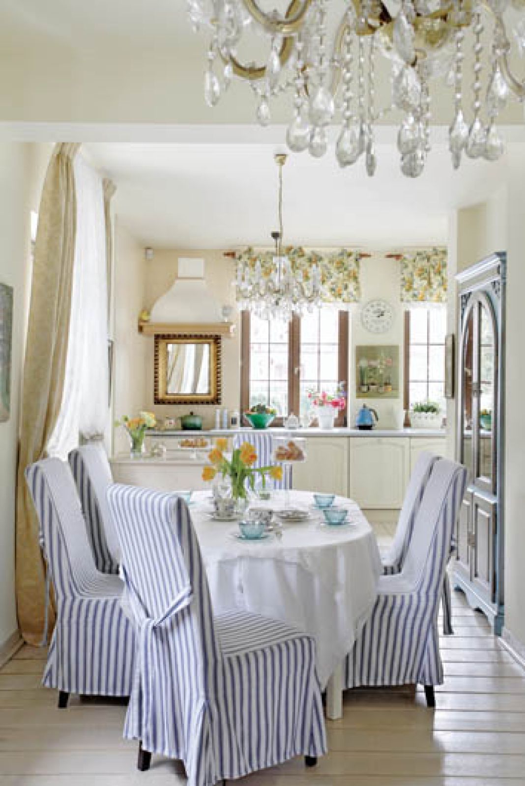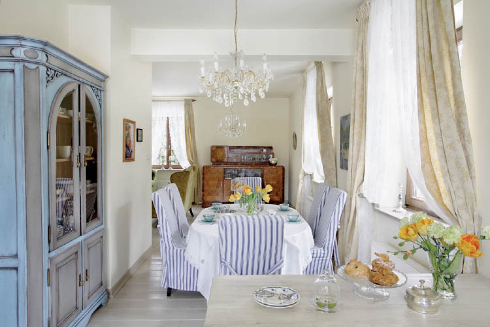 Dlatego obok toskańskiego saloniku urządziła marynistyczną jadalnię, w błękitach i bieli (marzy o domu z widokiem na morze). A w sypialni w dużych dawkach pojawiły się turkusy (narzuta, obraz Grzegorza Kalinowskiego) – to z tęsknoty za lazurem wody.