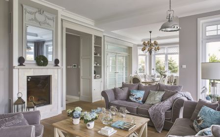 Dom w stylu francuskim w bieli, szarości i błękicie