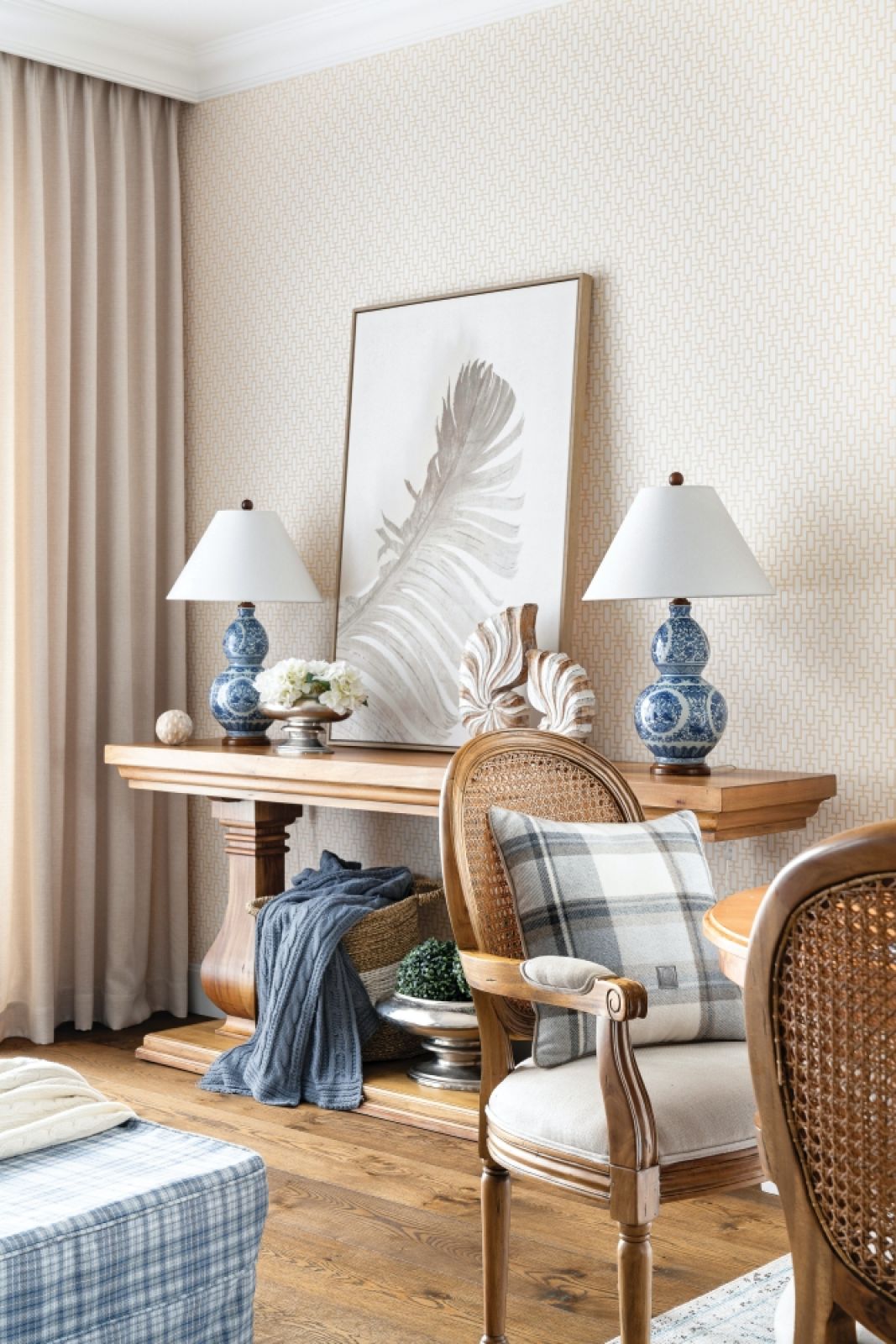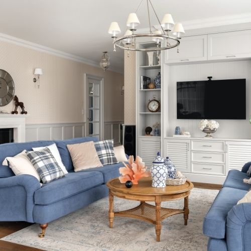 Aranżacja domu w stylu hamptons – pełne światła wnętrza w kolorach ziemi i morza