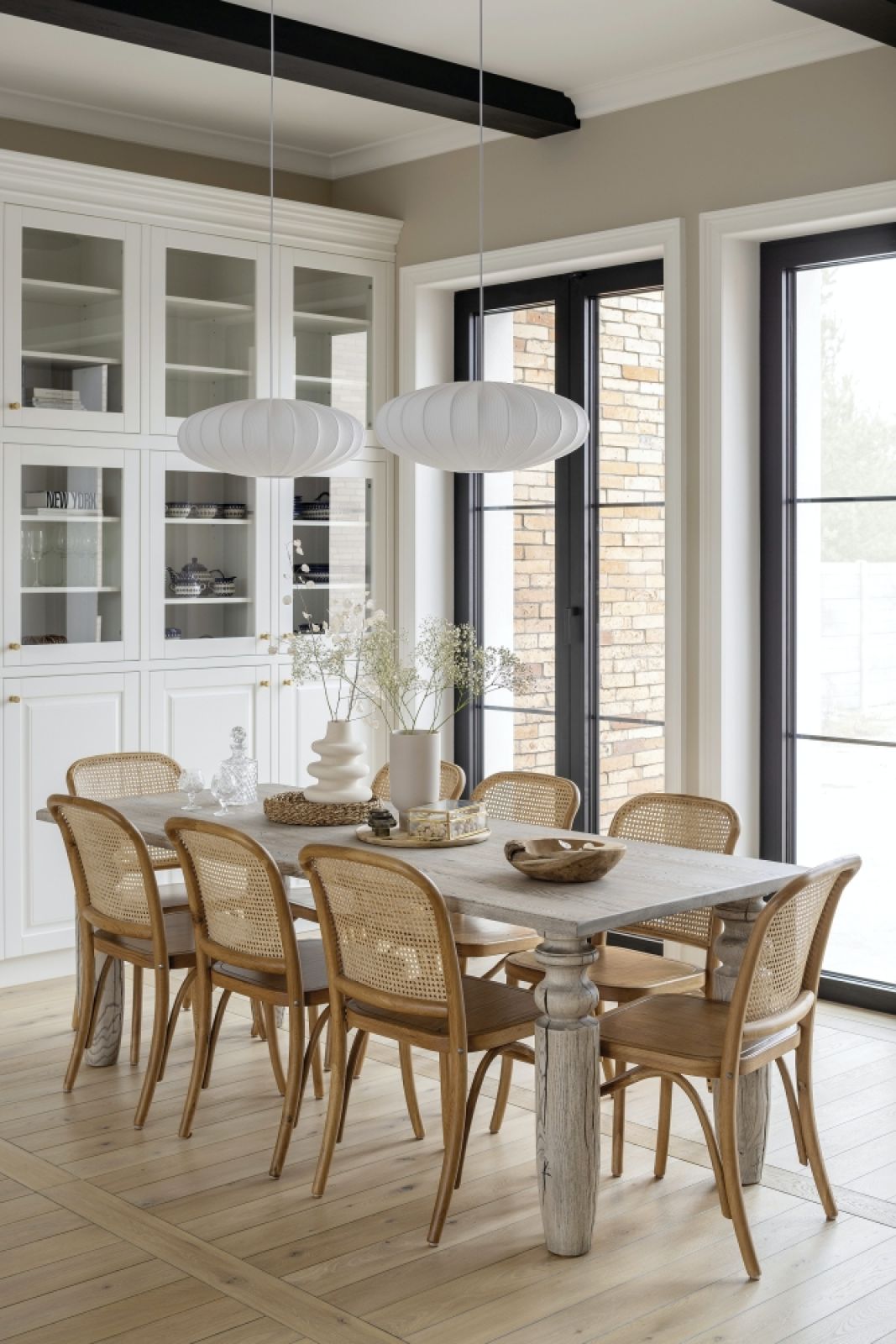 Maria zastała więc dobrze przygotowaną bazę pod przyszły projekt - nie trzeba było robić żadnych korekt, wyburzać czy przesuwać ścian - typowych praktyk, kiedy dom nie jest budowany od początku na miarę. W dodatku świetnie dogadywała się z właścicielką - mają podobny gust, więc współpraca szła jak z płatka. Zwykle było tak, że Agata przesyłała jakieś zdjęcia inspiracyjne, a projektantka odpowiadała jej propozycjami konkretnych rozwiązań, mebli czy dodatków. Całą zabudowę kuchenną i łazienkową oraz meble, takie jak na przykład kredens w jadalni, wykonywał stolarz według projektów Marii.