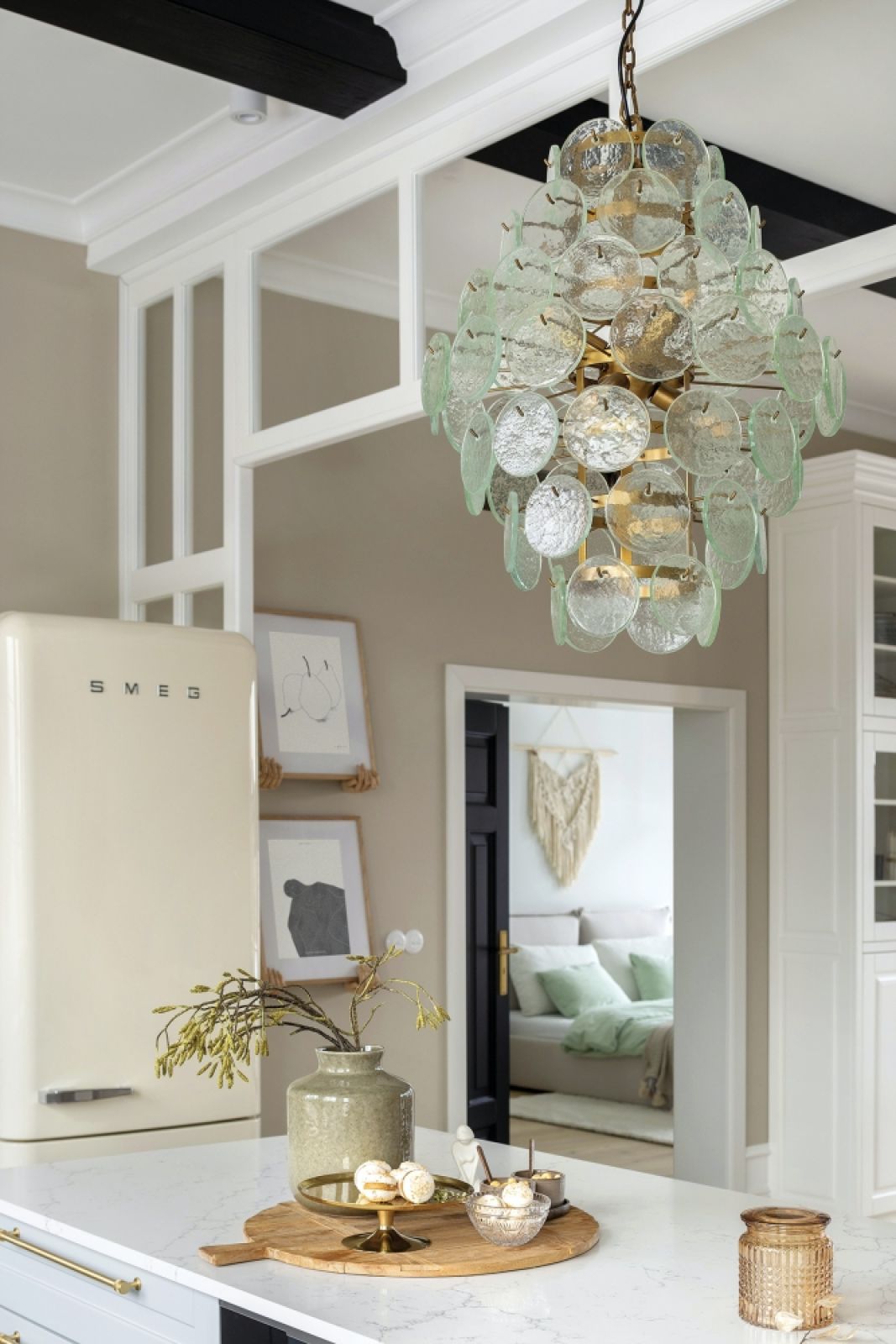 Jednym z motywów przewodnich są ułożone w cegiełkę płytki - na ścianach kuchni i łazienek oraz wzorzyste czarno-białe mozaiki na podłogach. Dzięki takim zabiegom dom wygląda jak z żurnala - imponuje spójnością estetyczną, przestrzennym ładem. Nie ma w nim natłoku przedmiotów, a wyborne detale, takie jak ceramika, żyrandole, grafiki są dobrze widoczne i „mają czym oddychać”. – Mieszkamy tu już prawie rok i zdążyliśmy się przekonać, że nic, ale to nic, nie zmienilibyśmy w naszym domu - śmieje się Agata. - Czy to nie najlepsza rekomendacja Marii, która właśnie kończy kolejny apartament w Nowym Jorku i jest trudno uchwytna?