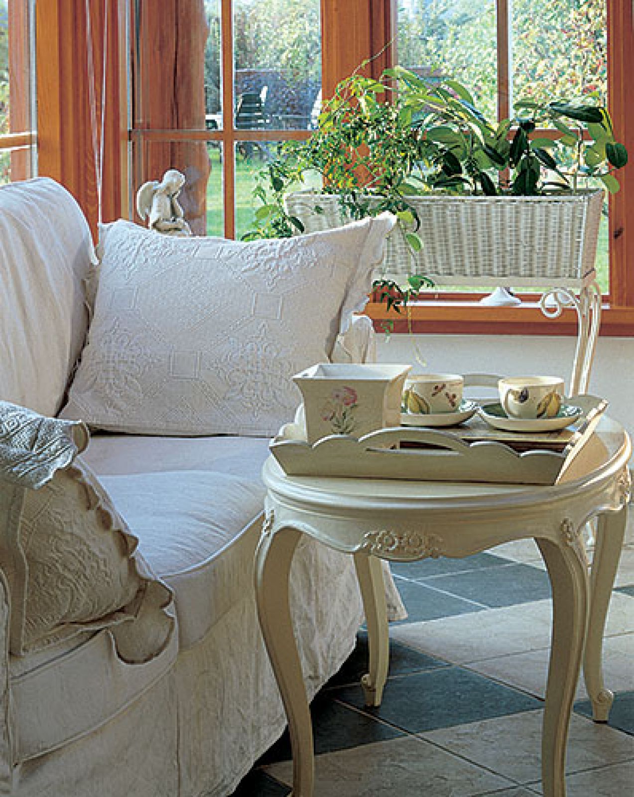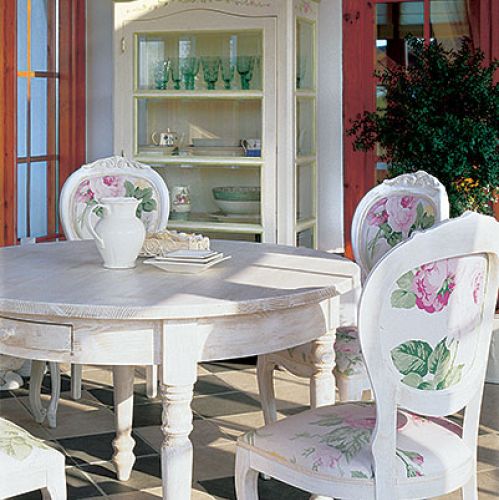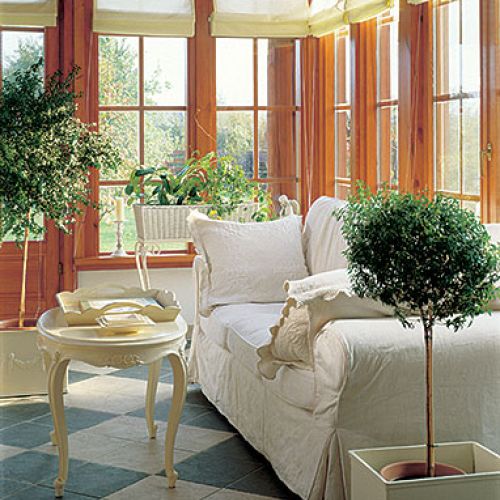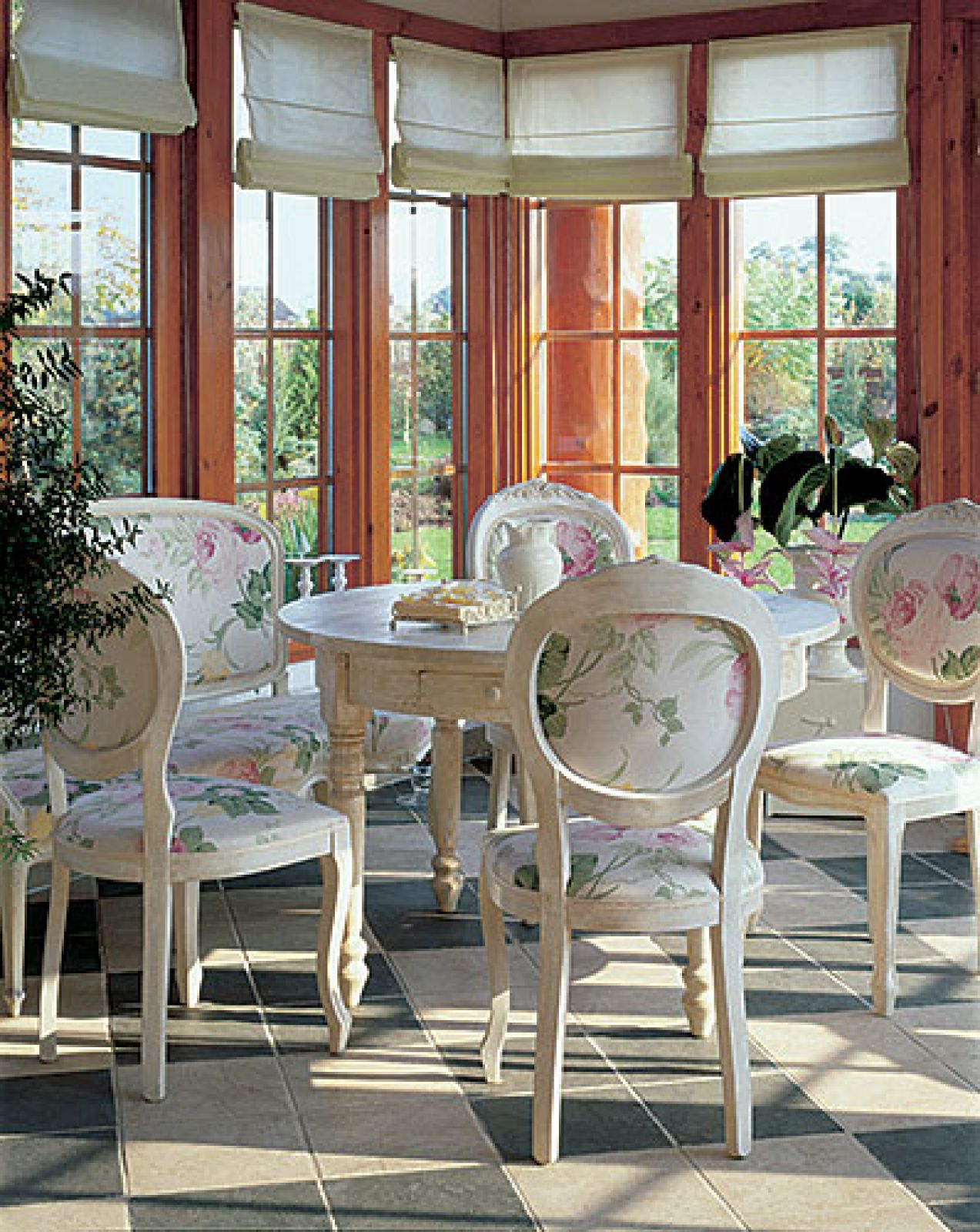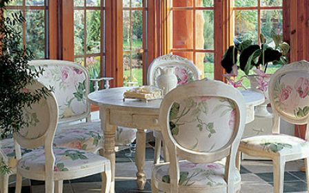 Taras został zadaszony i obudowany szklanymi ścianami. Kupione w „Fabryce wnętrz” stół i i krzesła zmieniły tapicerkę na wzory kwiatowe. Za oknami widok, który można podziwiać o każdej porze roku i przy każdej pogodzie. I przesiadywać w ogrodzie nawet wtedy, kiedy lato jest kapryśne.