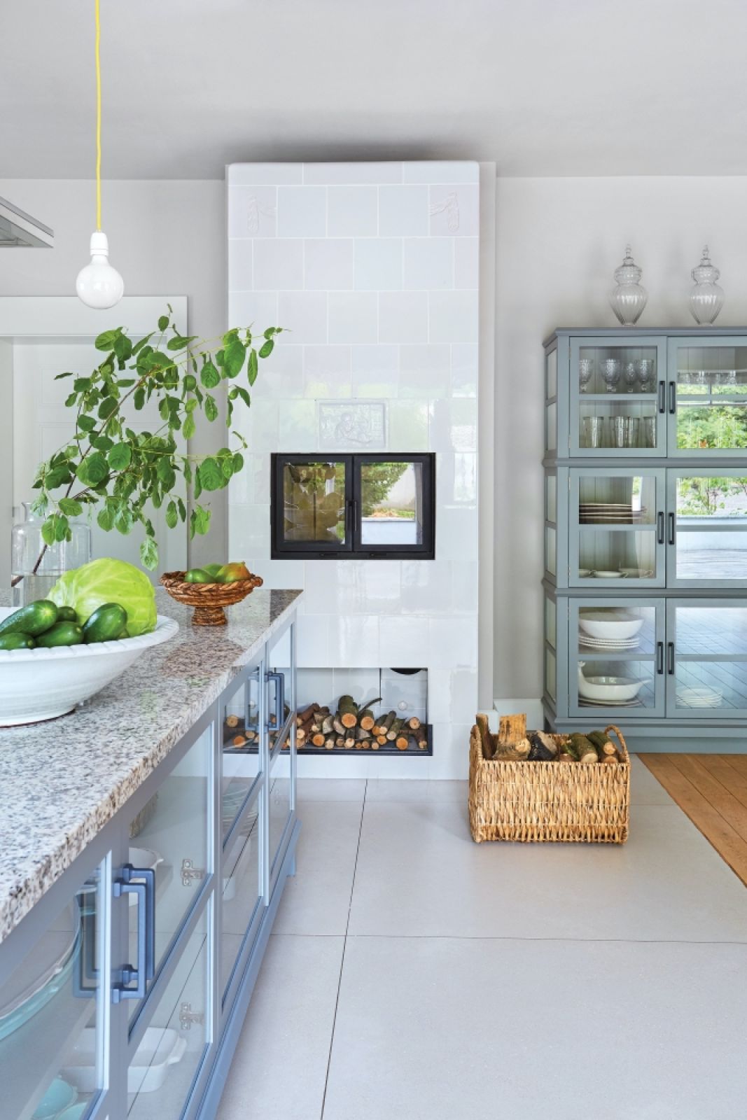 Ciekawy jest też tutaj kominek. Ma palenisko znacznie wyżej niż standardowy. Bo Irmina chciała mieć „ogień w oczach” – czyli widok na palenisko, kiedy robi coś przy blacie kuchennym. Jego obudowa powstała z kafli z rozebranego starego pieca. Jeden z nich jest zabytkowy i wkomponowano go na honorowym miejscu ponad paleniskiem.