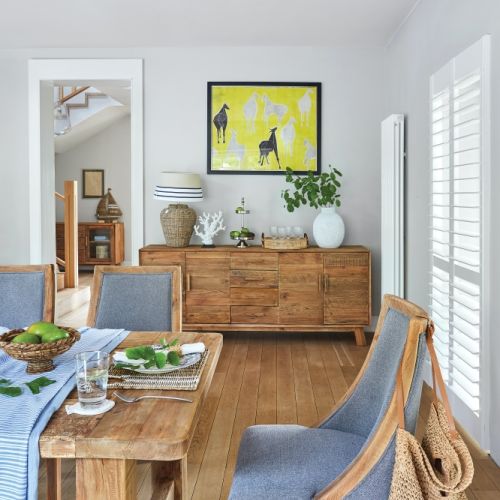 We wnętrzach pojawiły się morskie dodatki i meble firmy Bemondi. Proste w formie, ciekawie wybarwione, z wyrazistymi słojami z kolekcji Woodside. – Wybrałam je, bo nie są produkowane masowo, mają wysoką jakość i solidne wykonanie. Pasują więc do koncepcji Weranda Home, gdzie dba się o każdy szczegół – mówi stylistka.