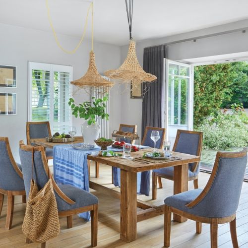 Naturalne niedoskonałości mebli są atutem, nadają charakter całej aranżacji. Żeby jednak przełamać tę surowość, Kasia dodała eleganckie, ale nieprzesadnie dekoracyjne dodatki w marynistycznym duchu. Dopasowała je do otoczenia willi. – Śmieję się, że powstał lokalny styl hamptons, luźny, niezobowiązujący, przytulny. Taki, w otoczeniu, którego dobrze się odpoczywa – dodaje.