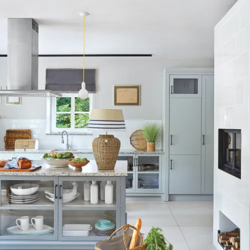 Ciekawe rozwiązanie – kuchnia z nietypową wyspą z witrynami zamiast szafek