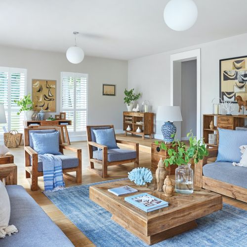 Rezydencja w drewnie i błękitach – w tych wnętrzach połączono elegancję stylu hamptons i naturalność stylu eko
