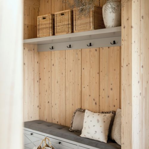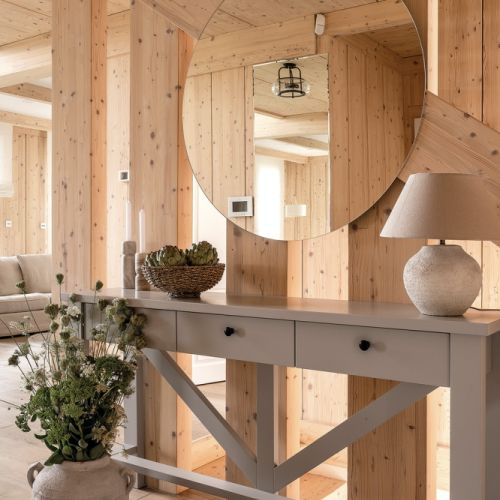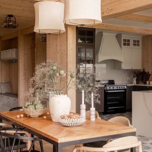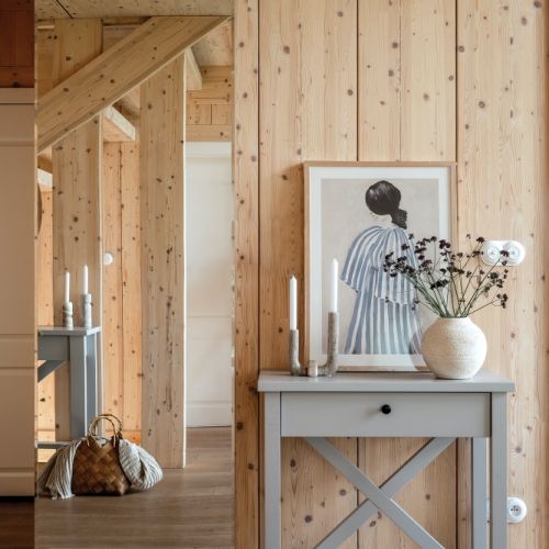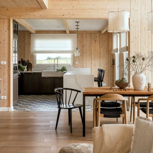 Naturalne materiały i ciepłe, pastelowe kolory w drewnianym domu