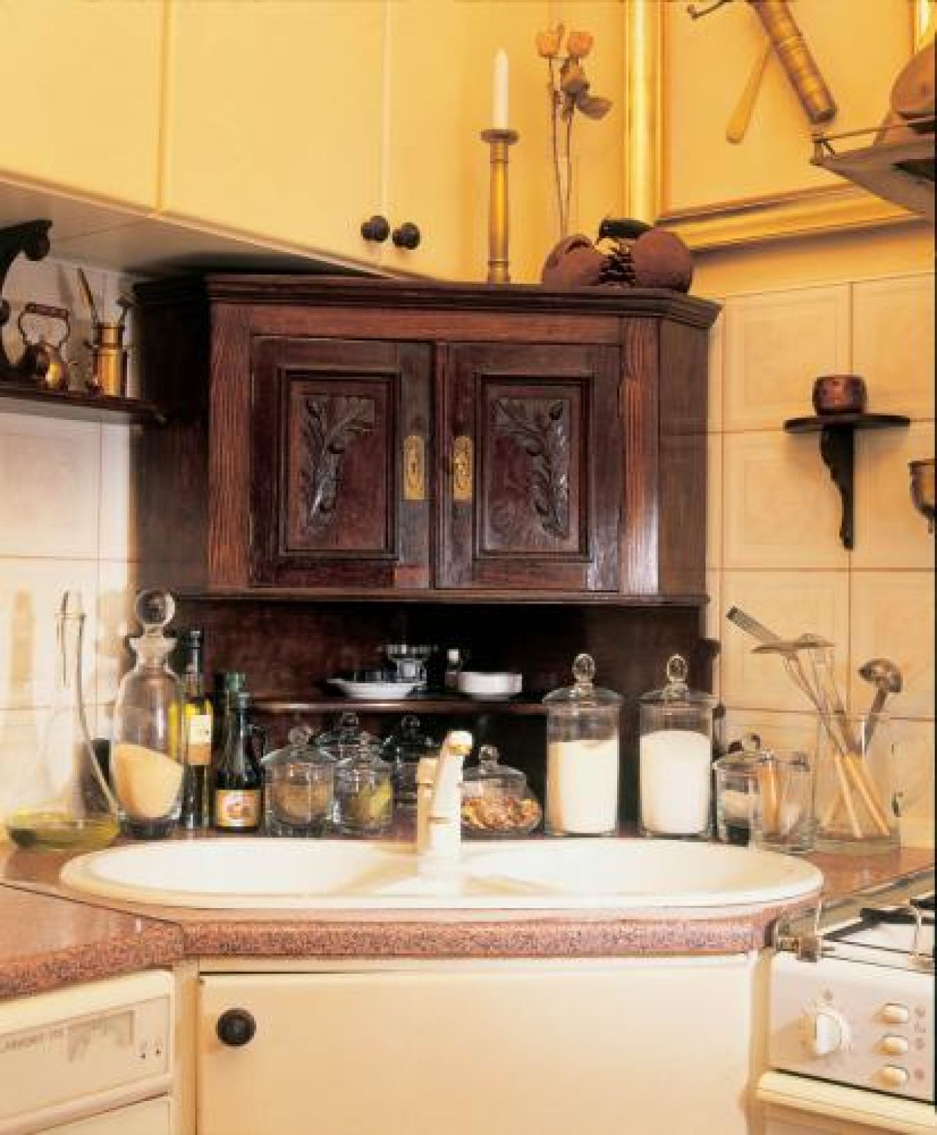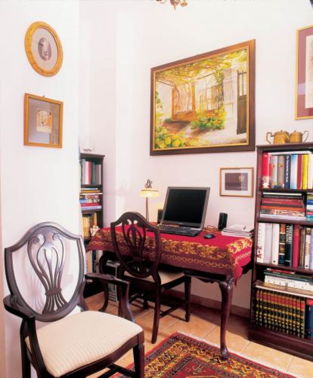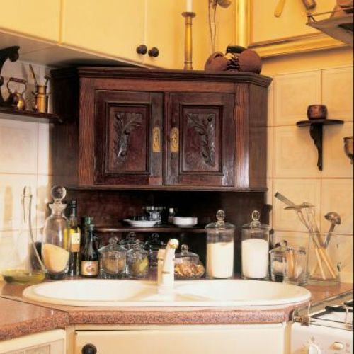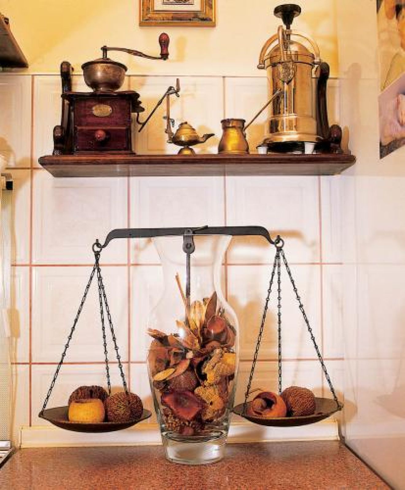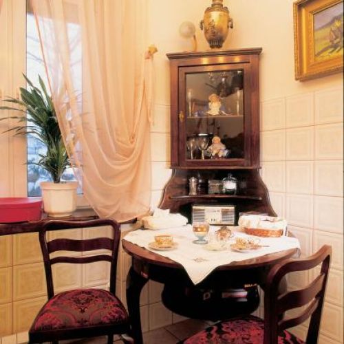 Jak na dworek przystało, musiała się tu znaleźć biblioteka, w której tylko laptop bezlitośnie przypomina, że mamy XXI wiek. Kolekcji książek o sztuce mogłaby pozazdrościć niejedna czytelnia. W kuchni też jest się czym zachwycać. Cuda zdziałał tu zaprzyjaźniony stolarz – pan Jurek. Zmniejszył stół i połączył z kątówką, nad zlewem zamontował szafkę na chleb. Do tego wszystkiego pani Teresa dołożyła wymyślone przez siebie dekoracje: wagę w wazonie i martwą naturę z łyżką i młynkiem w ramie.