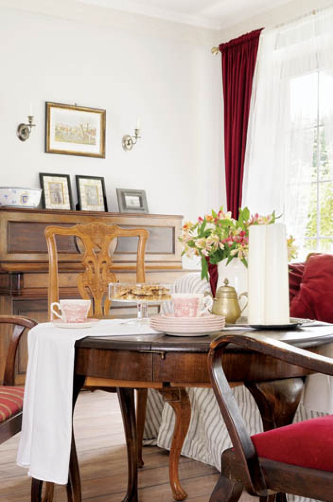Aż pewnego dnia Monika dostała na imieniny spory kredens. Stanął w salonie i gryzł się nieco z malowanymi mazurskimi starociami, ale że był raczej nie do ruszenia (prezent od mamy), to malowane sprzęty musiały się poddać i po kolei wędrowały na poddasze. Reprezentacyjną część domu zaczęły wypełniać stylowe kredensy (z giełdy w Słomczynie), ciężkie tkaniny, rozłożyste siedziska, gustawiańskie lustra i lampy.