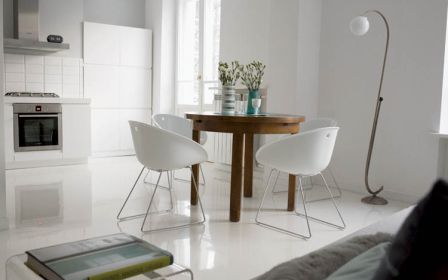 Pomysł na wystrój był prosty: połączyć rzeczy nowoczesne ze starymi. – Miałam sporo mebli, których nie umiałam się pozbyć, ale nie chciałam też, żeby mieszkanie było przytłoczone a'la antykami – tłumaczy Miłka. Jest więc szafa (prezent ślubny rodziców), biblioteczka po cioci, stół po babci, lecz wszystko w otoczeniu młodego dizajnu: włoskich krzeseł Pedrali, geometrycznej kanapy filcowej Noti, stolika-ducha marki Habitat, plastikowej szafki i lamp z Kartella. Jako tło Miłka wybrała nowoczesną, rozświetlającą biel. Również na podłodze z żywicy epoksydowej, która bardzo rozjaśnia mieszkanie.