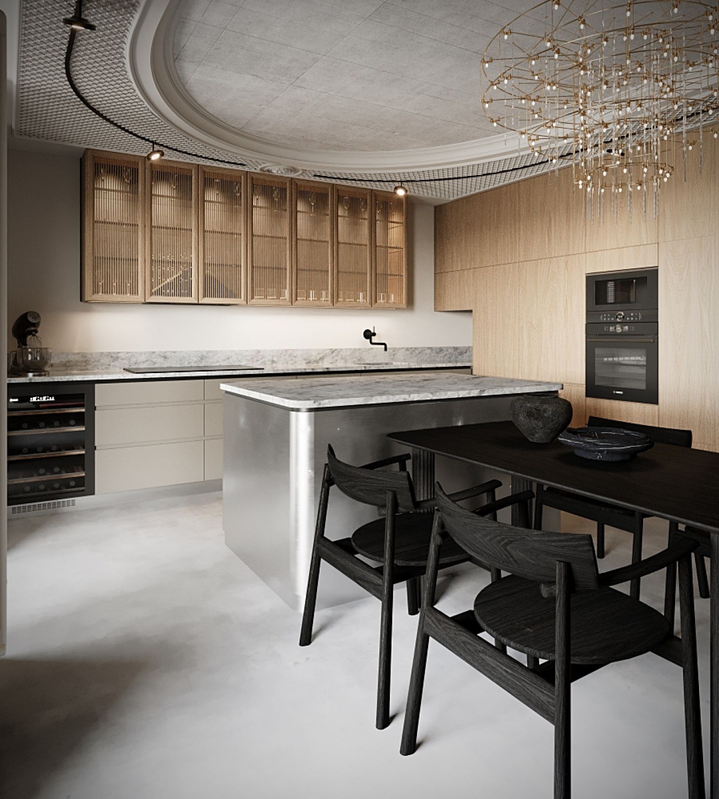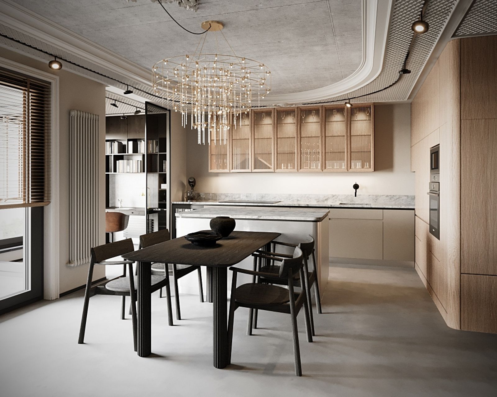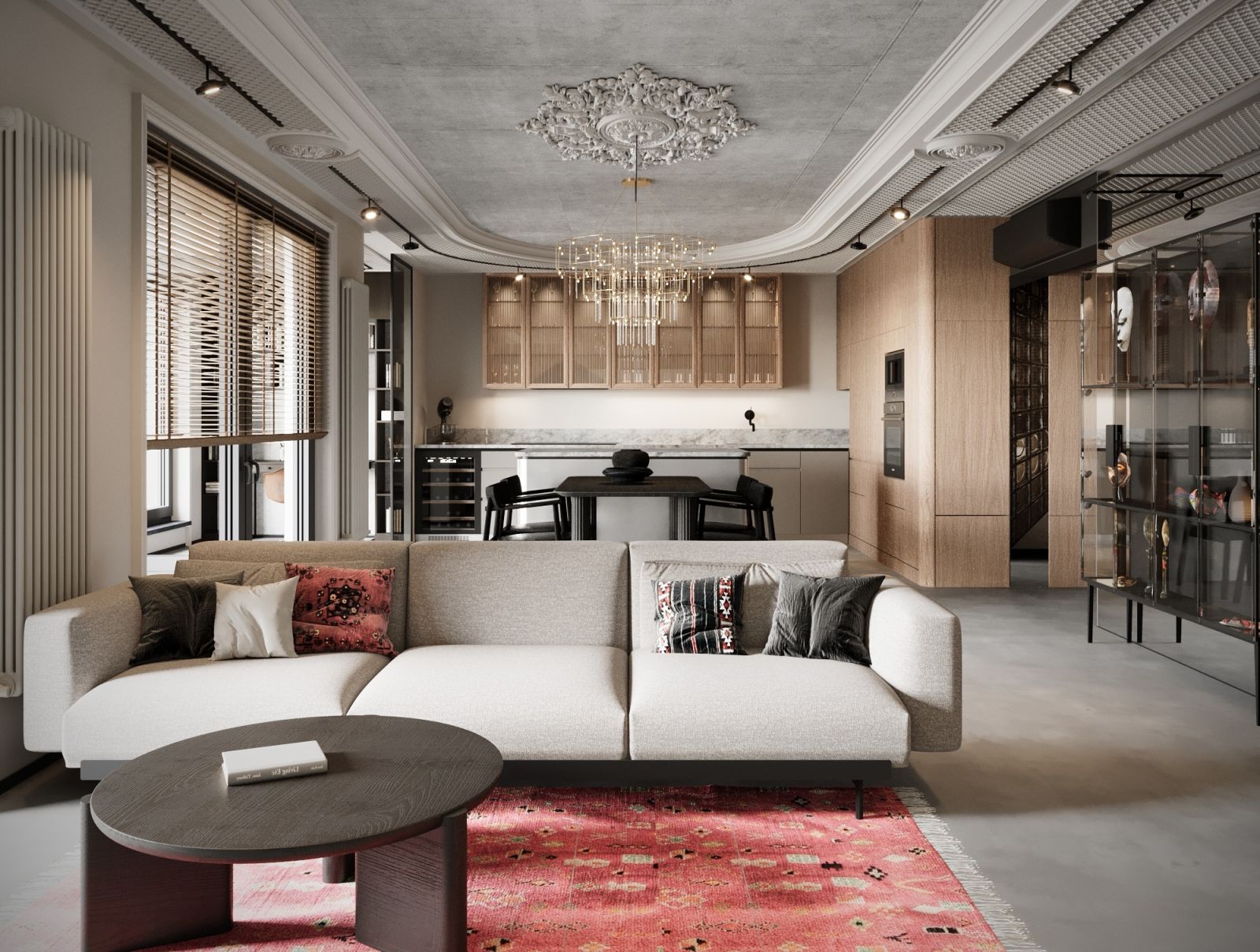 Najbardziej spektakularnym punktem jest salon połączony z kuchnią i jadalnią, w którym uwagę przykuwa sufit – wyjątkowo bogato zdobiony sztukaterią, uzupełniony dekoracyjnym żyrandolem. Te misterne elementy zostały wyeksponowane na tle z betonu architektonicznego. Niespodziewany kontrast estetyczny sprawia, że wzrok zatrzymuje się tu na dłużej. Industrialnych inspiracji dopełnia podłoga z mikrocementu.