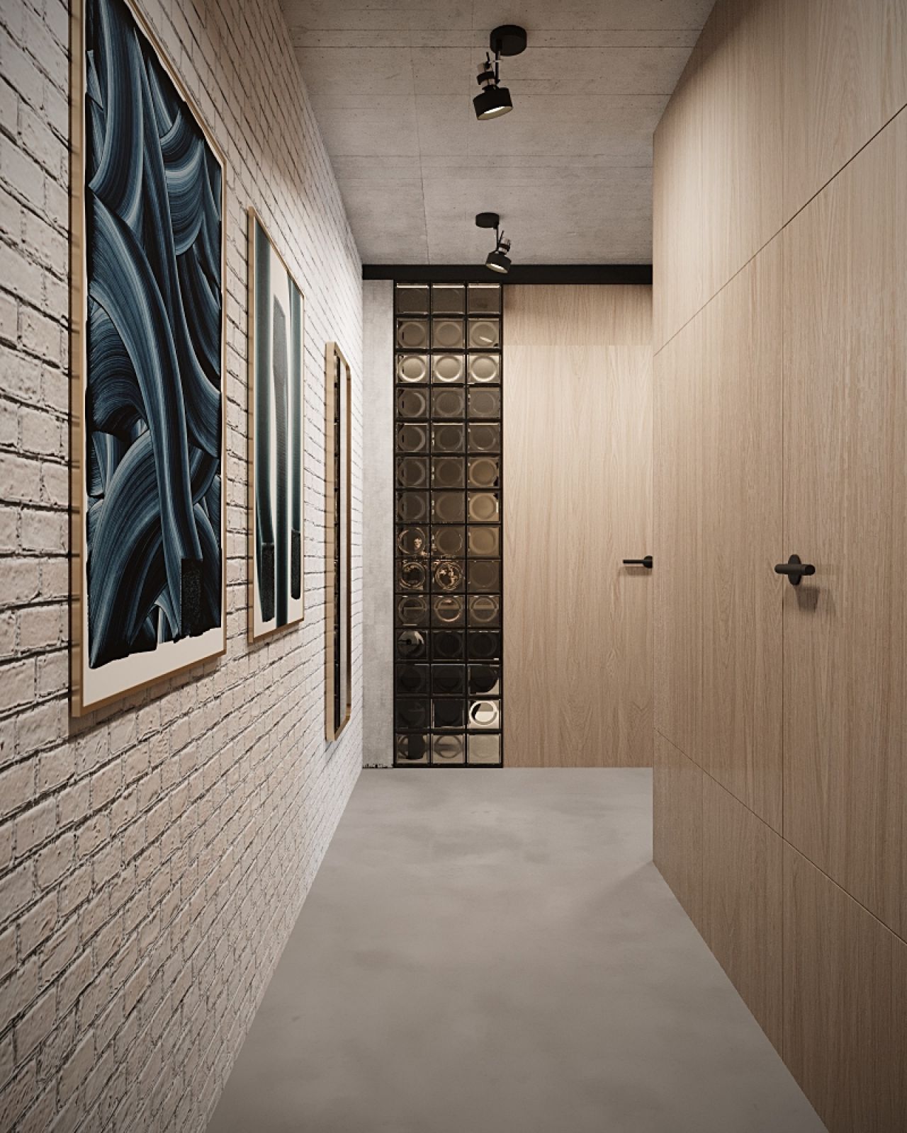 W małej łazience znalazł się prysznic oraz przestronna strefa umywalki, w której dominują kamień i antracytowy fornir. Czarna toaleta idealnie wtapia się w tę aranżację, „chowa się” na tle dominującej umywalki. Kabina prysznicowa ustawiona obok luksferowej ściany zyskuje w ten sposób wyjątkowy akcent estetyczny. Luksfery pięknie przepuszczają światło dając efekt mieniącej się tafli. Klimat tego wnętrza kreują także detale – złota armatura, dodatki w matowej czerni, wyjątkowe, ceramiczne lampy przy lustrze i samo lustro z nastrojowym oświetleniem.