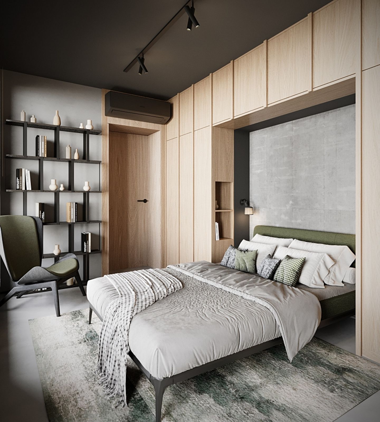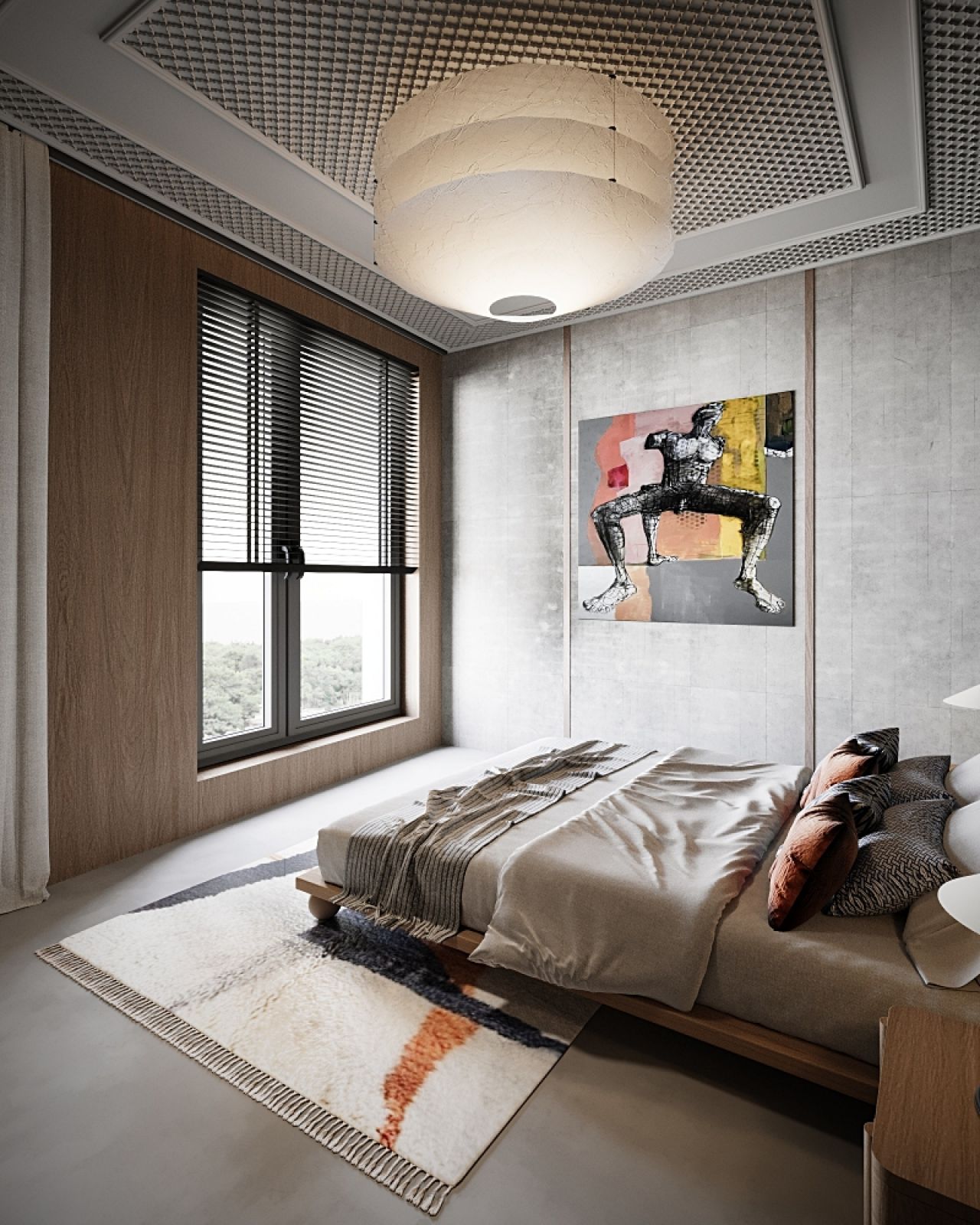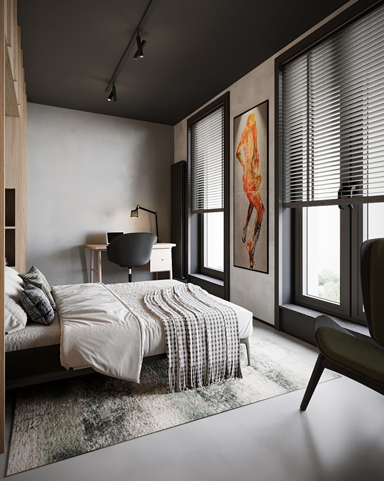 Druga sypialnia należy do syna właścicielki. Pokój pełen jest spójny z pozostałymi wnętrzami apartamentu – mamy tu betonowy sufit i ściany oraz cementową podłogę. Architektki postawiły jednak na ciekawe zestawienie loftowych elementów z dużą ilością ocieplającego wnętrze jasnego drewna.