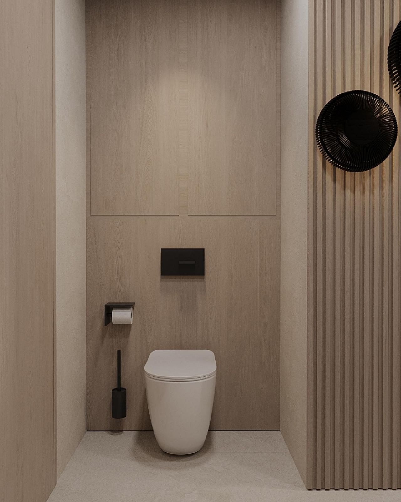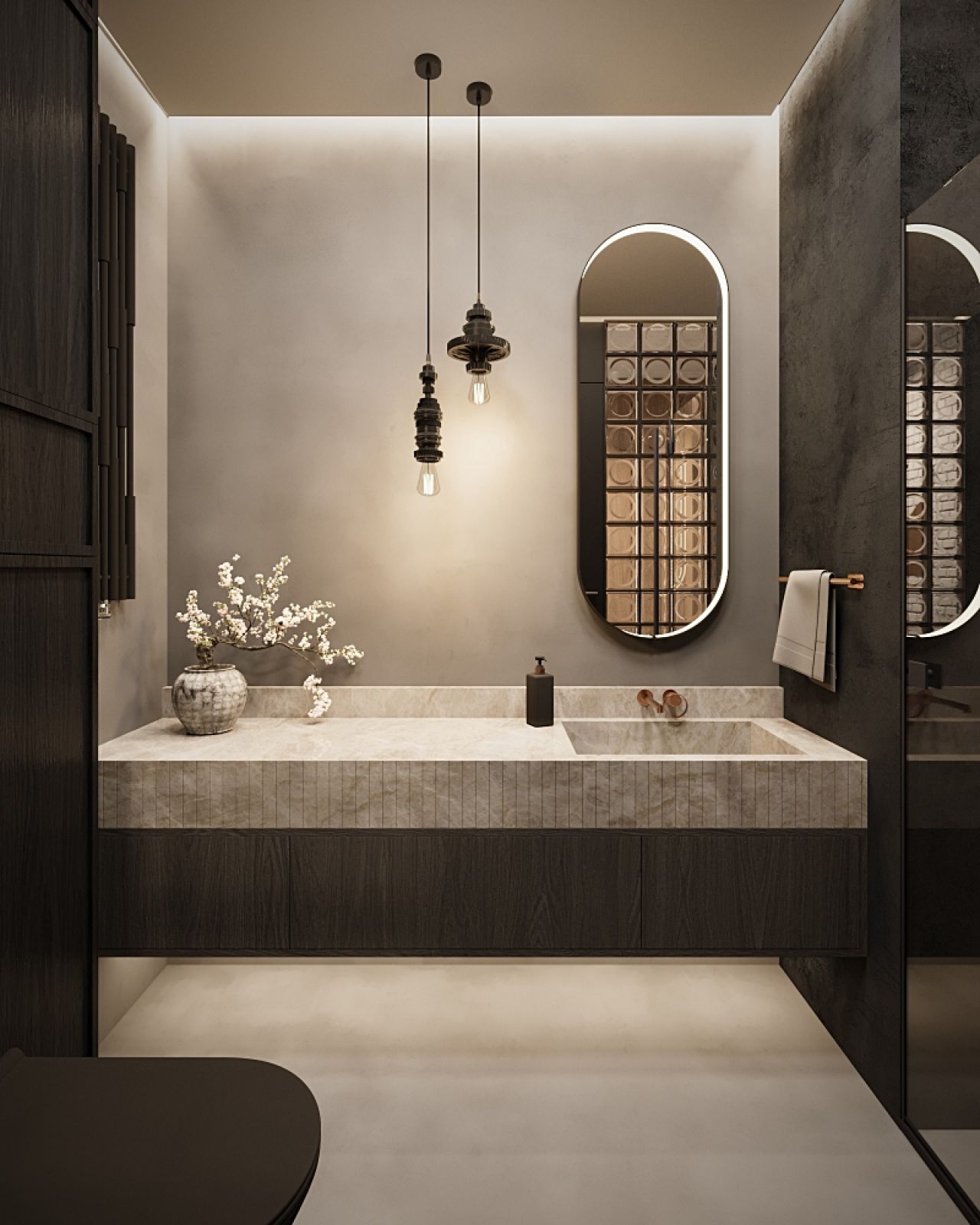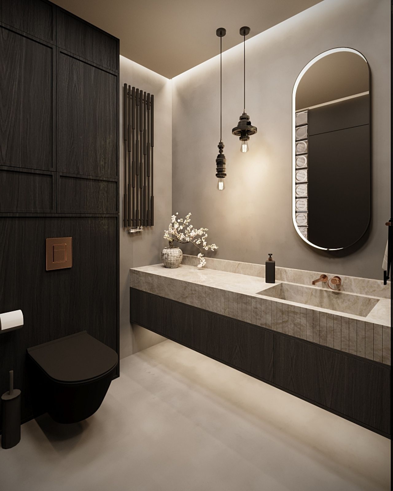 Strefę wanny podkreśla ściana z delikatnie żyłowanych płyt. Jasne okładziny zastosowane zostały również w kabinie prysznicowej z odpływem liniowym oraz na pozostałych ścianach i podłodze. Ciemne akcenty stanowią strefa z betonową misą umywalkową oraz przestrzeń toalety. Całość uzupełniają designerskie kinkiety nastrojowo doświetlające wnętrze.