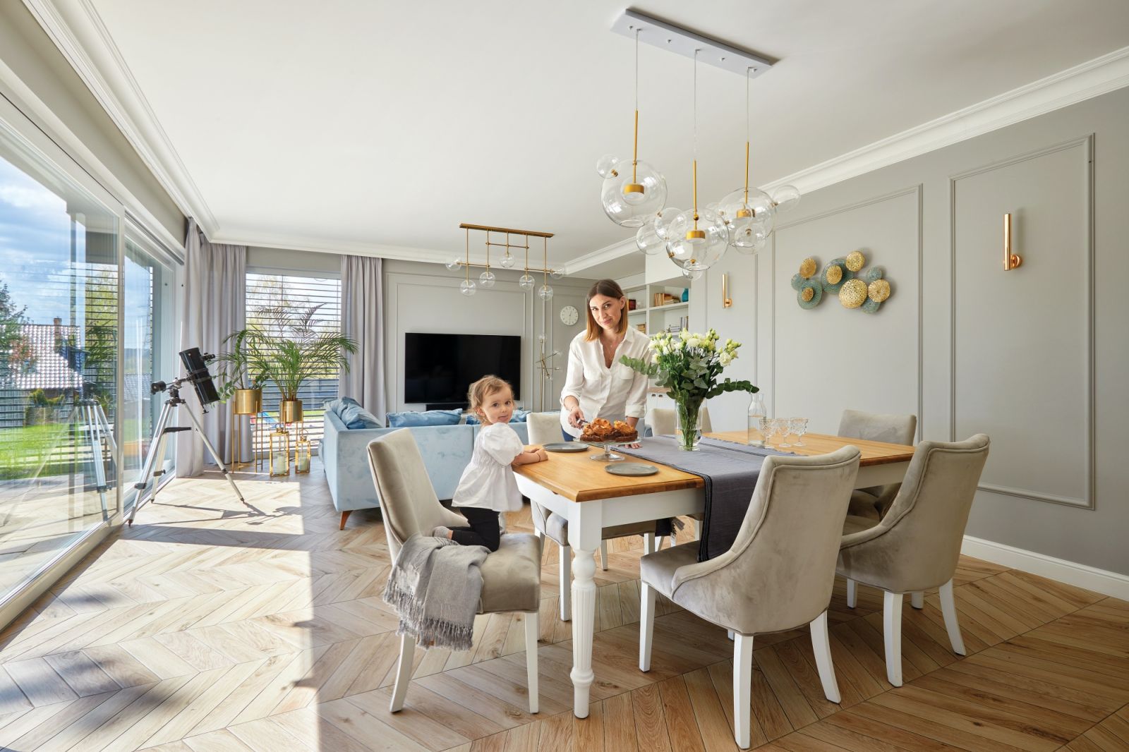 Karina kocha jasne kolory, które pięknie rozświetlają dom. Ciepłe szarości okazały się ponadczasową bazą – nie opatrzą się i nie znudzą. Na ich tle wybija się niebieski, w różnych tonacjach. – To był pomysł Kasi. Początkowo bałam się, czy nie będzie zbyt dominował – teraz widzę, jak cudownie ożywia stonowaną aranżację. Wkrótce miało też się spełnić kolejne marzenie Kariny i Bartka – w trakcie wykańczania domu okazało się, że niebawem na świecie pojawi się ich córeczka Zosia.